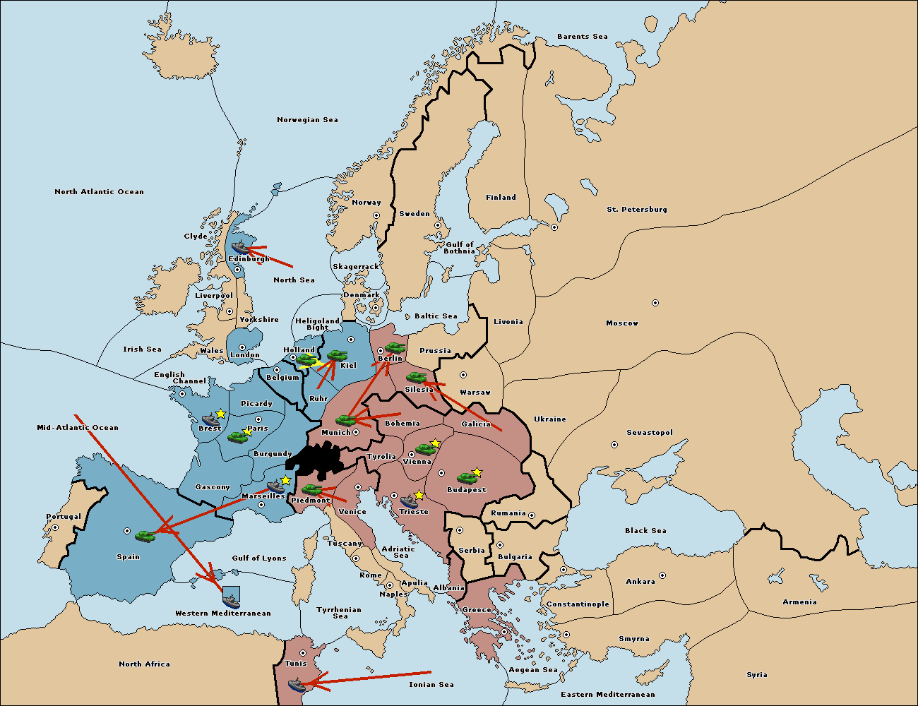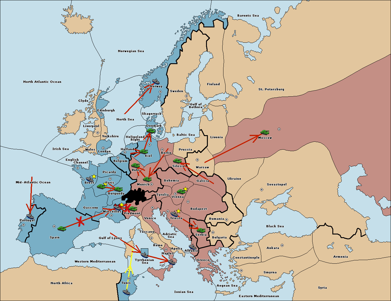 The fleet at Tyrrhenian Sea support hold to Gulf of Lyons.