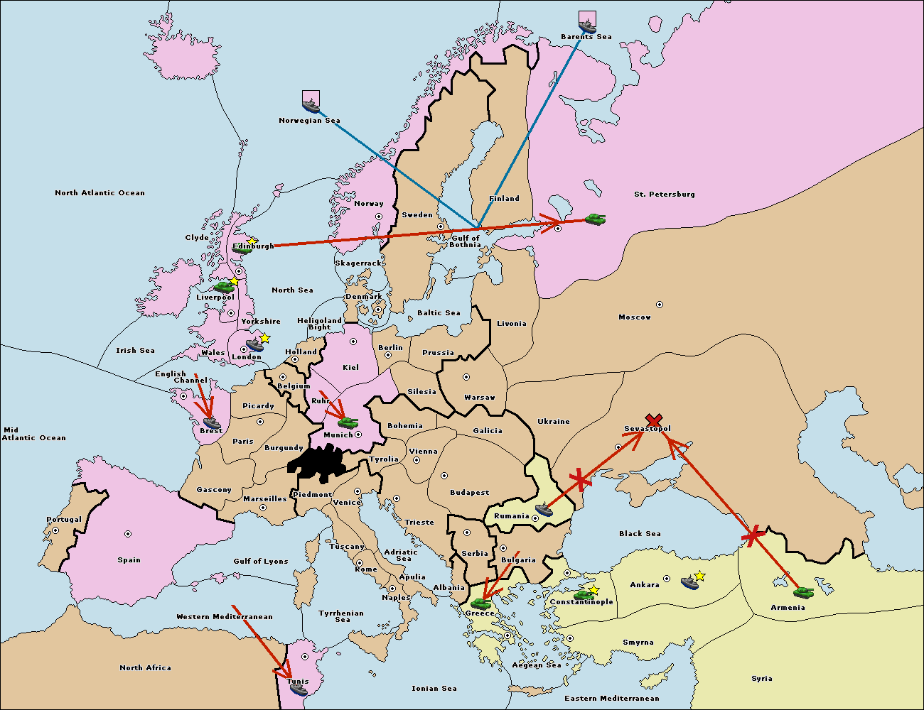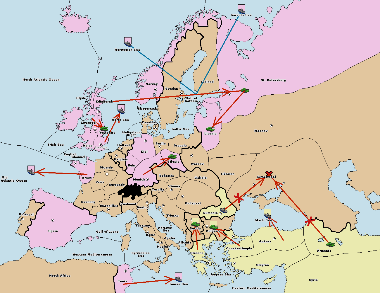 The fleet at Rumania support move to Sevastopol from Armenia.