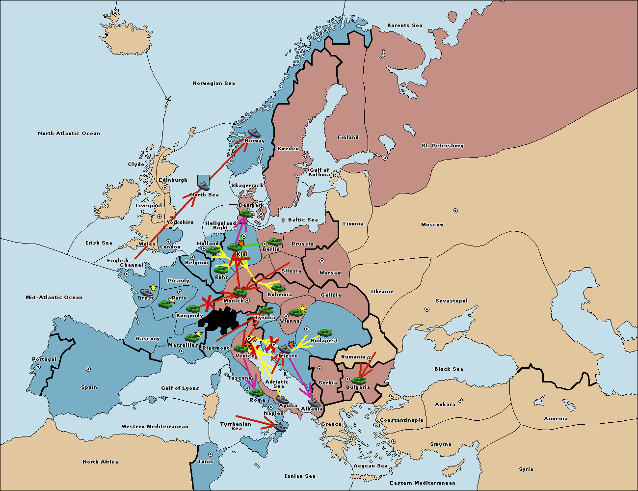 The army at Budapest support move to Trieste from Adriatic Sea.