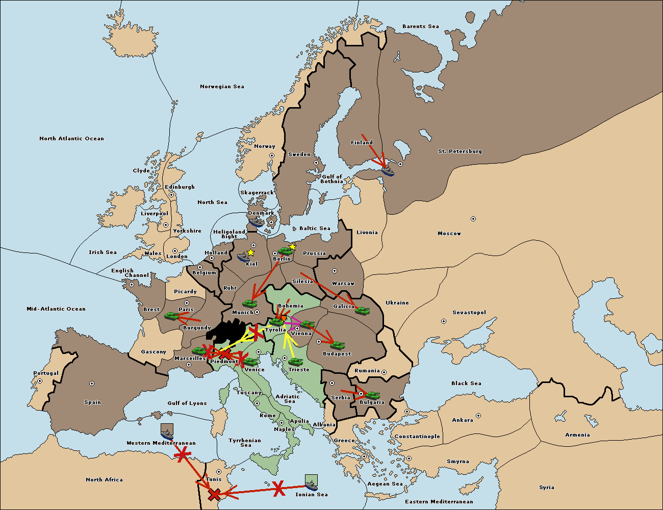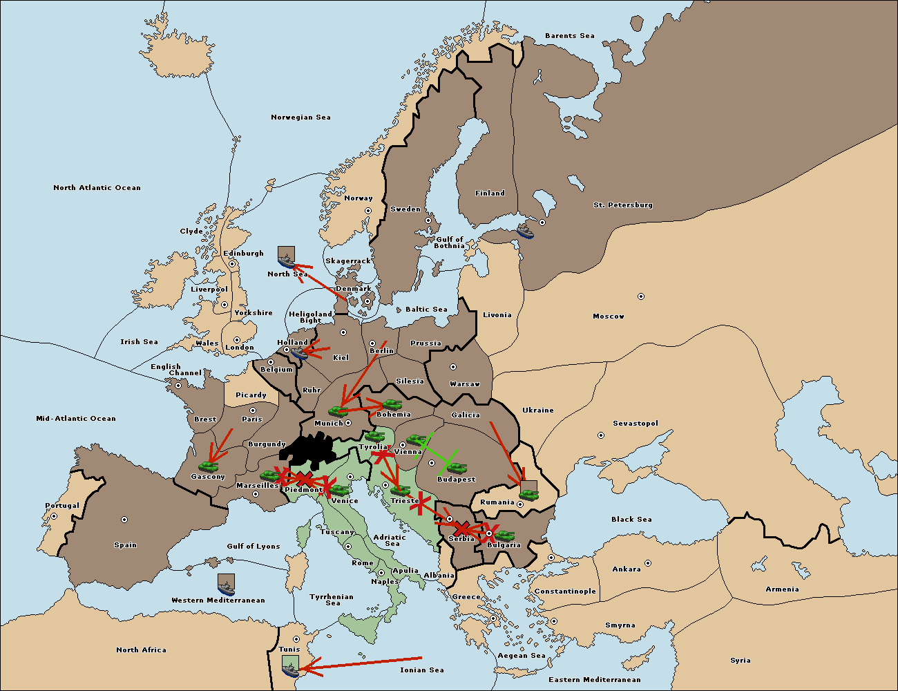 The army at Tyrolia support move to Piedmont from Marseilles.