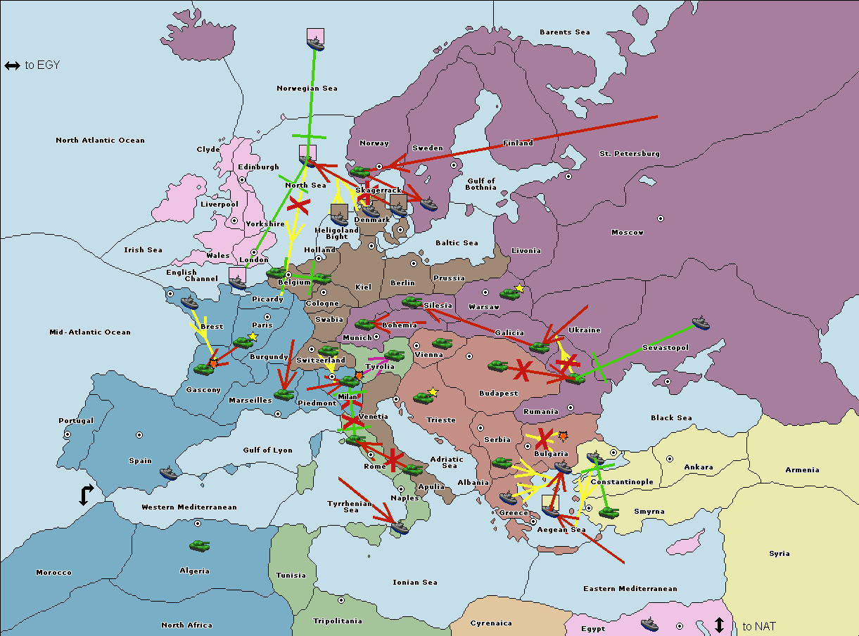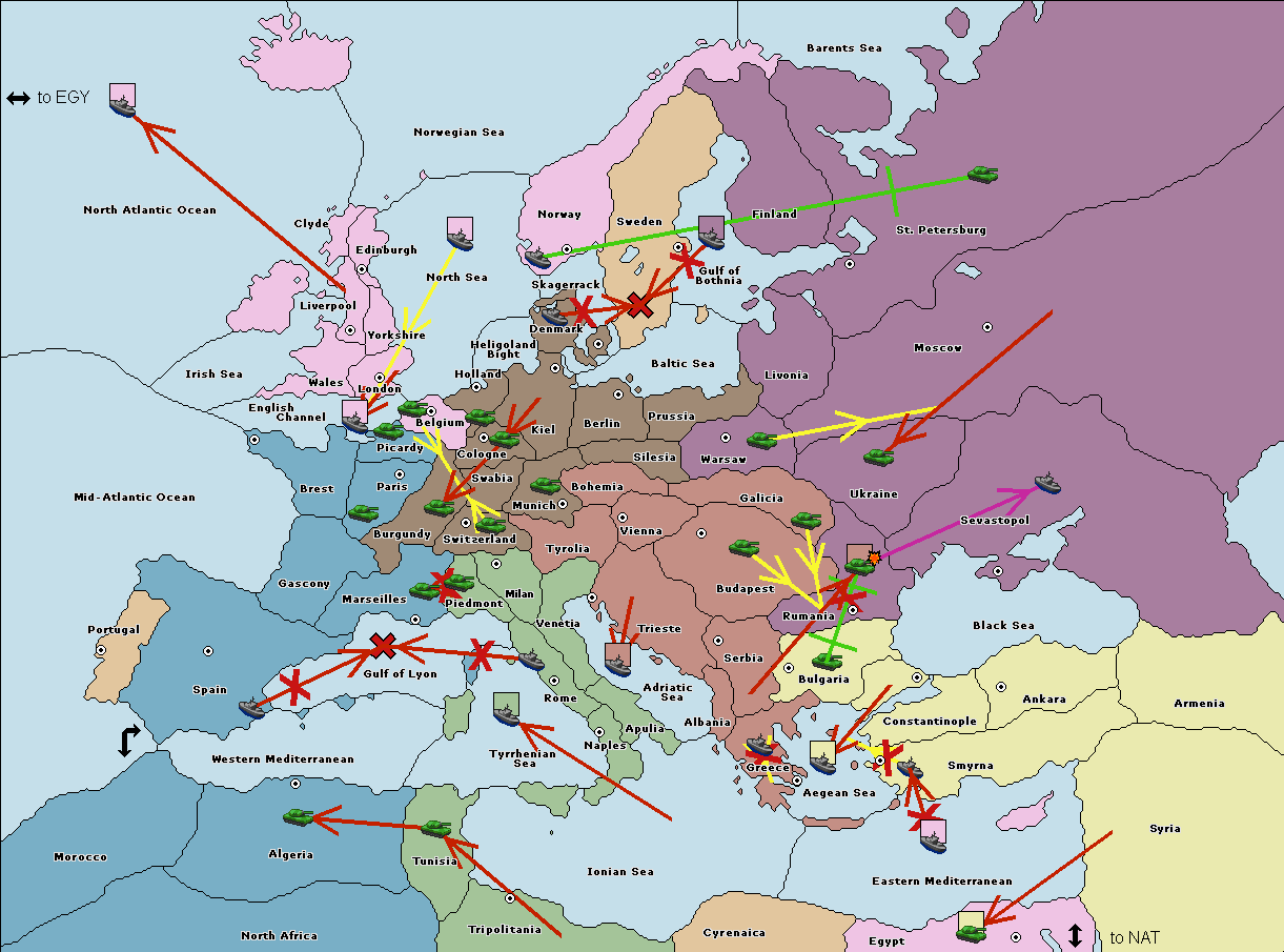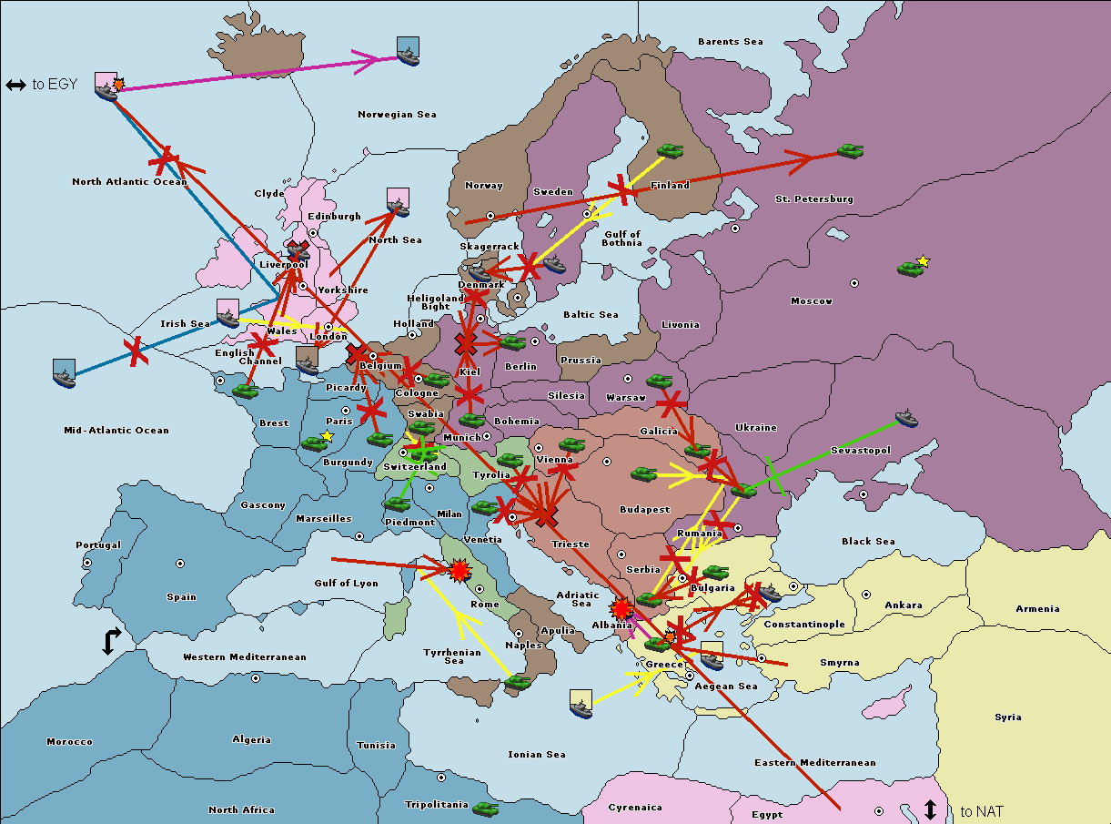 The fleet at Rumania support move to Bulgaria from Constantinople.