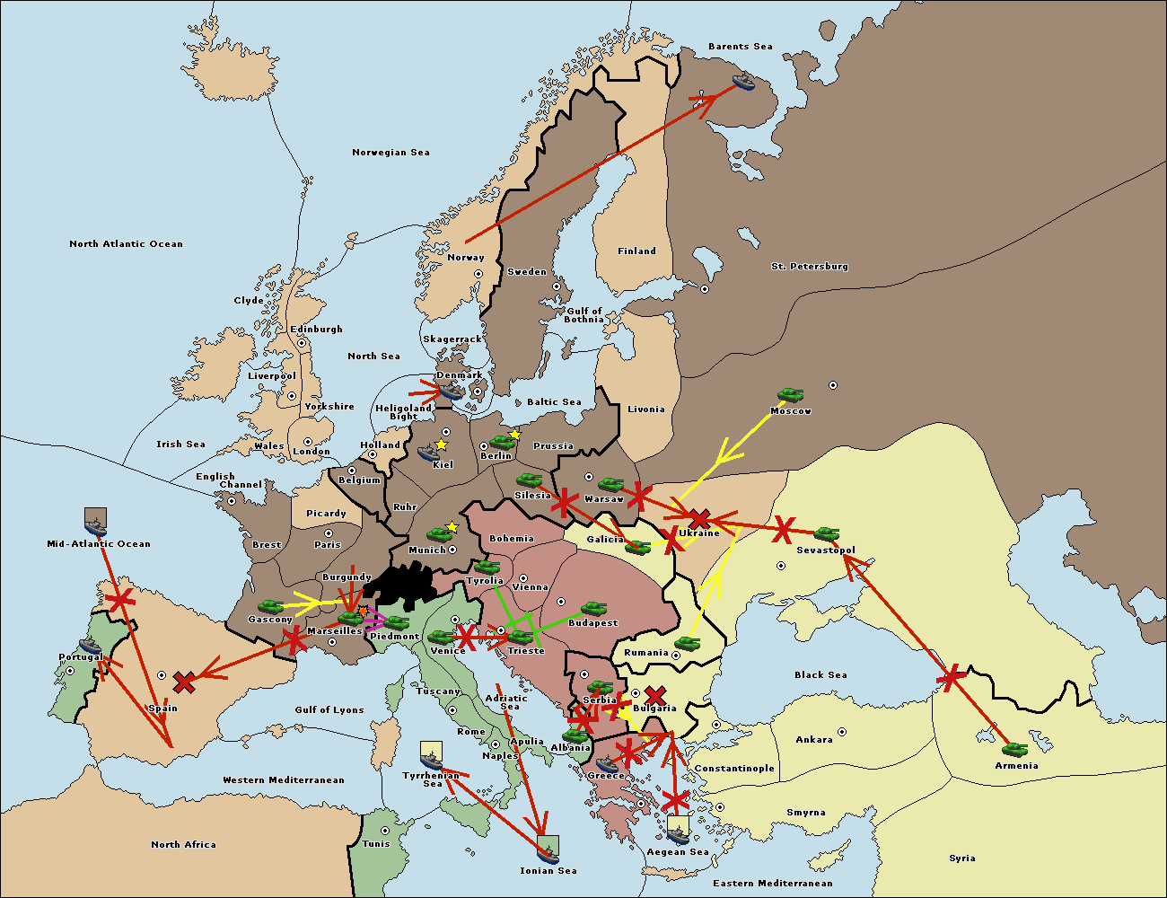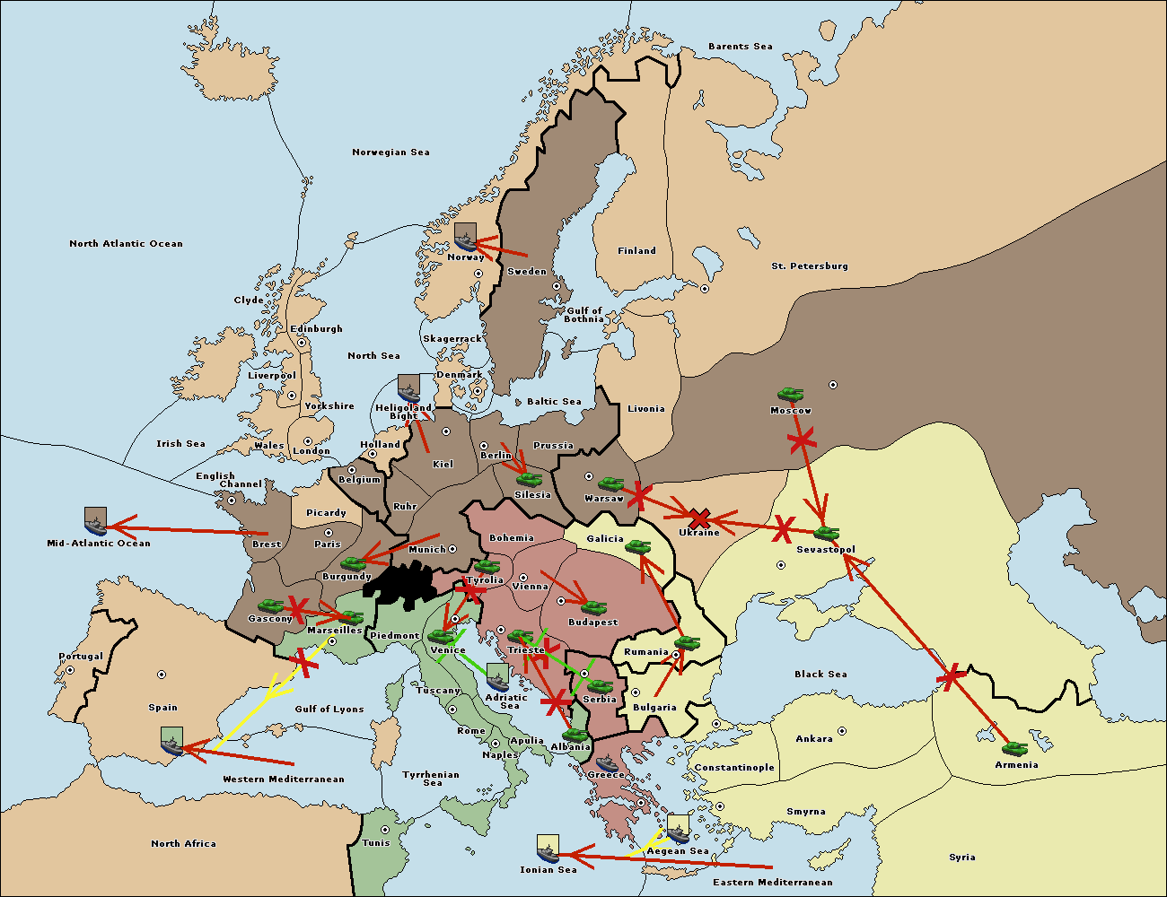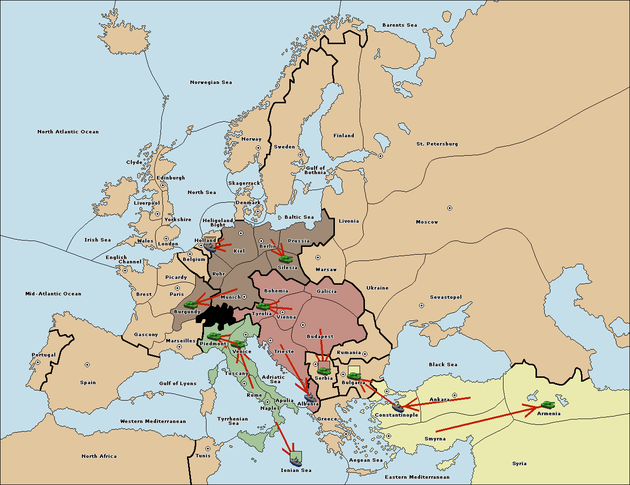 The army at Tyrolia support move to Piedmont from Marseilles.