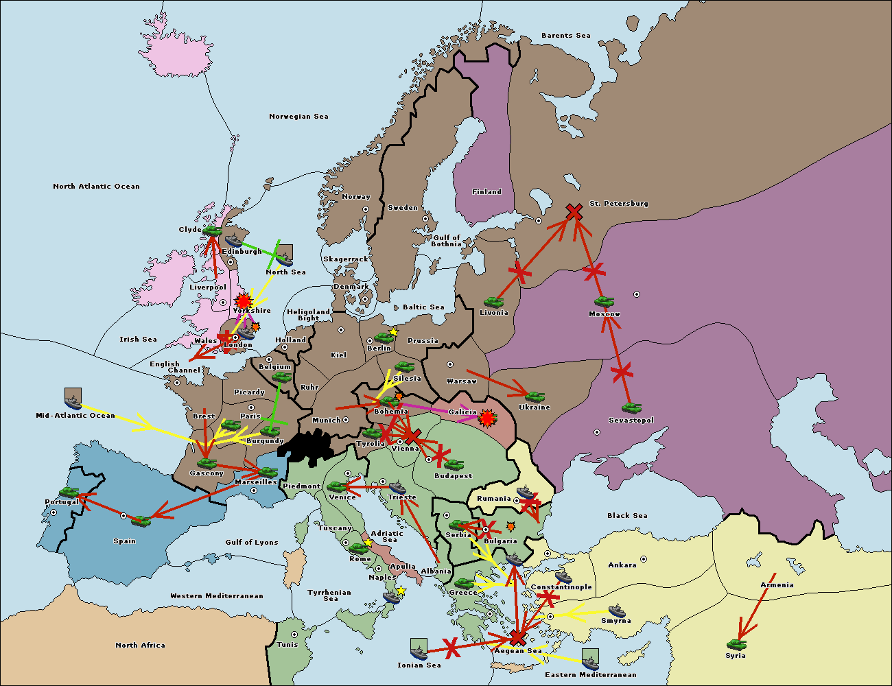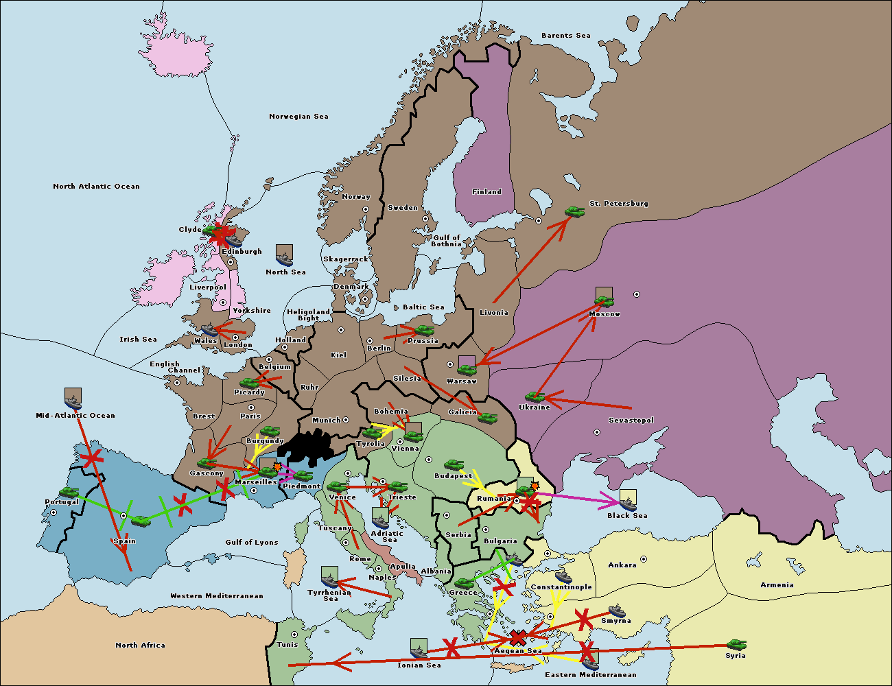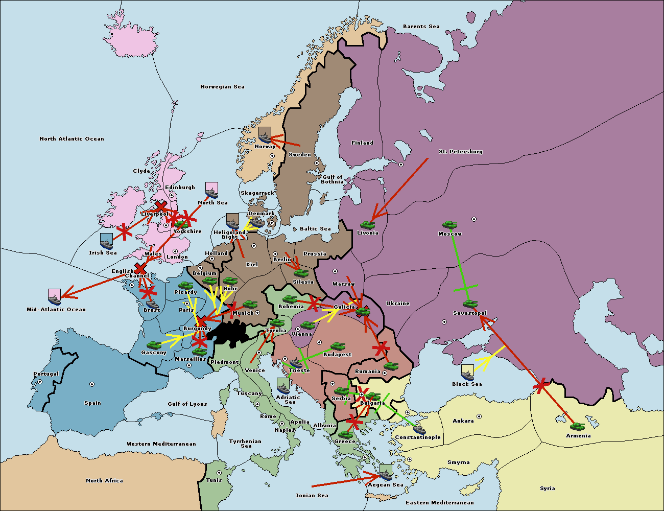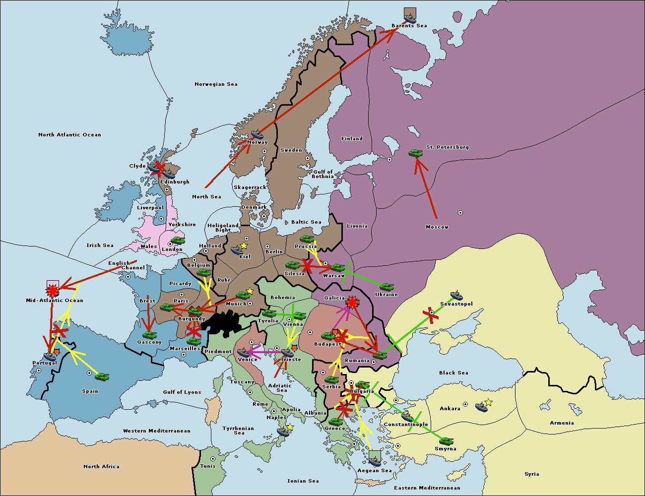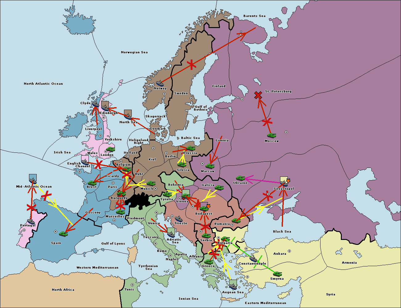 The fleet at Bulgaria (South Coast) support move to Constantinople from Aegean Sea.