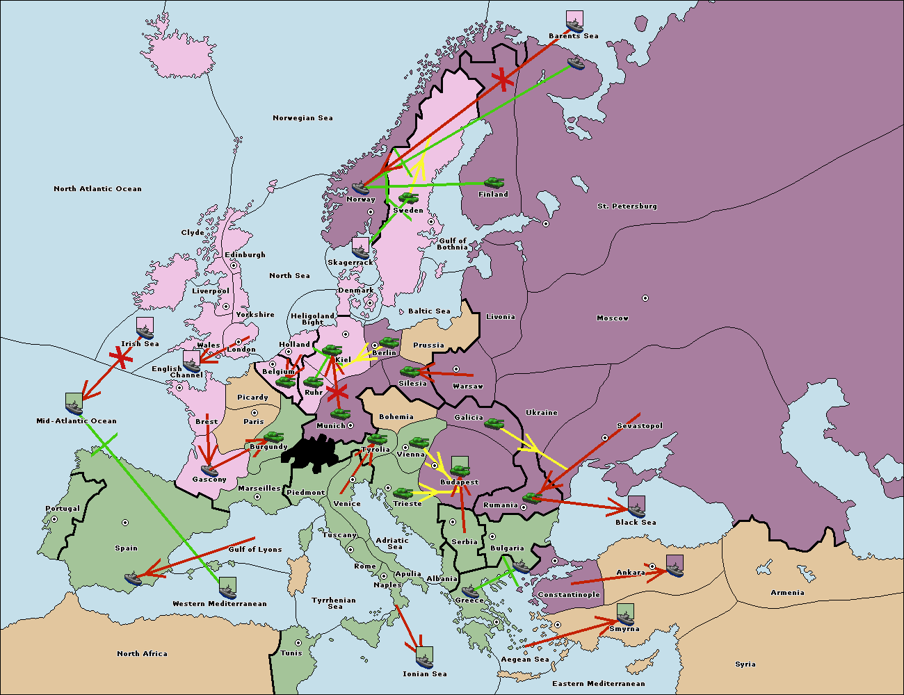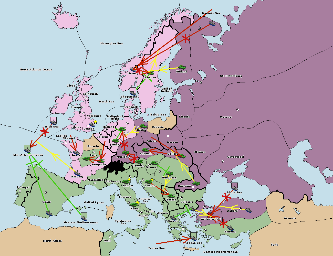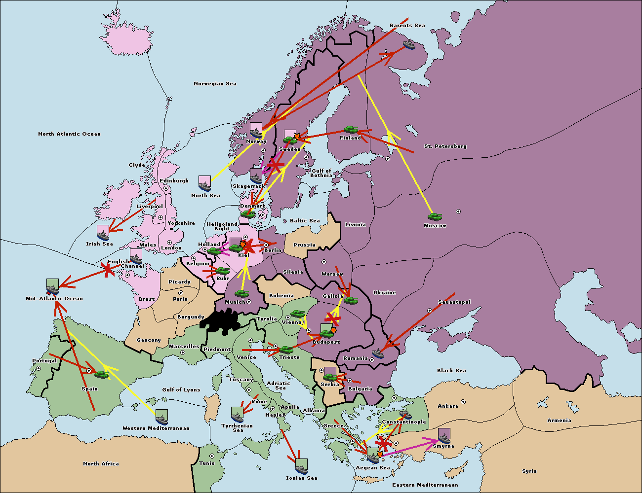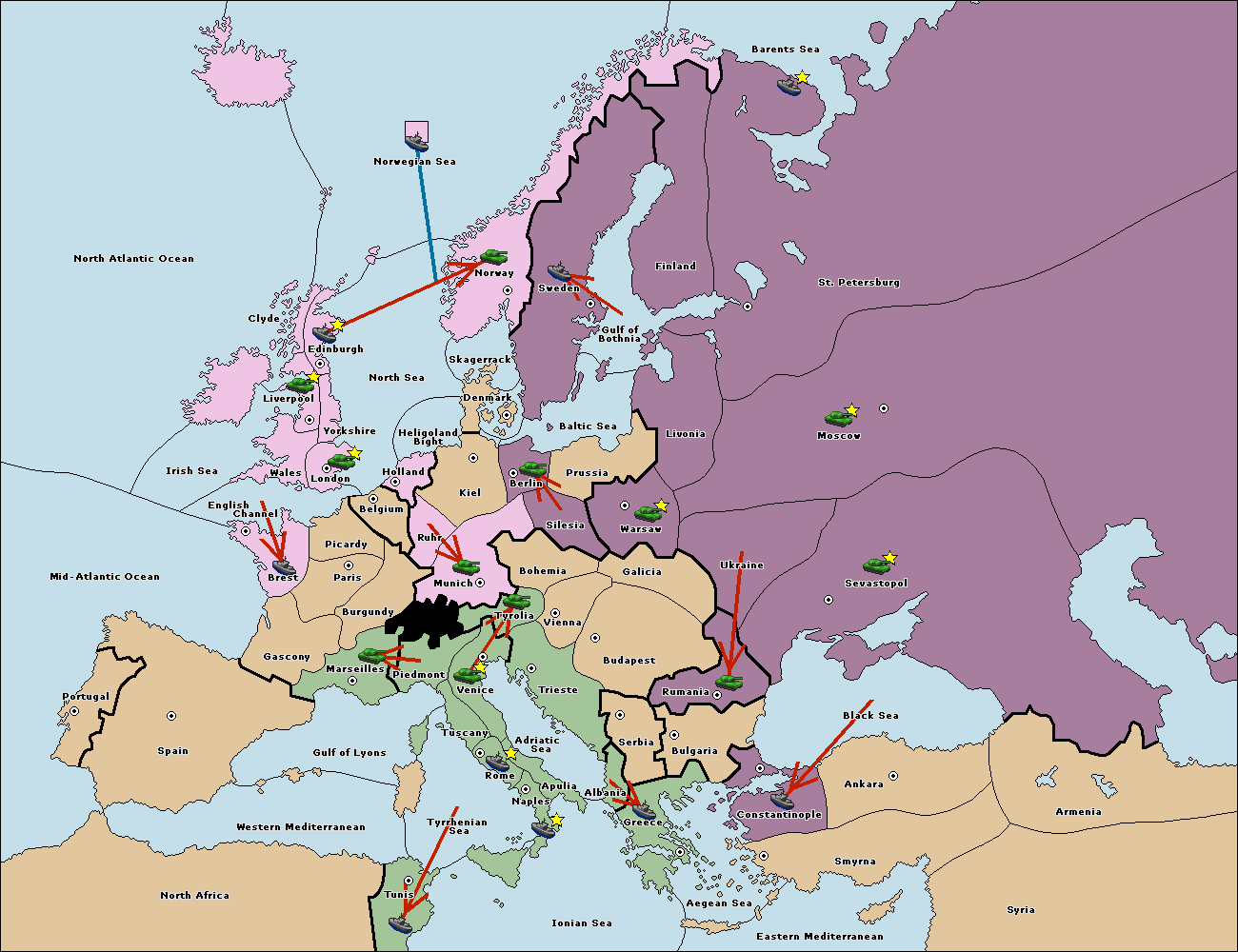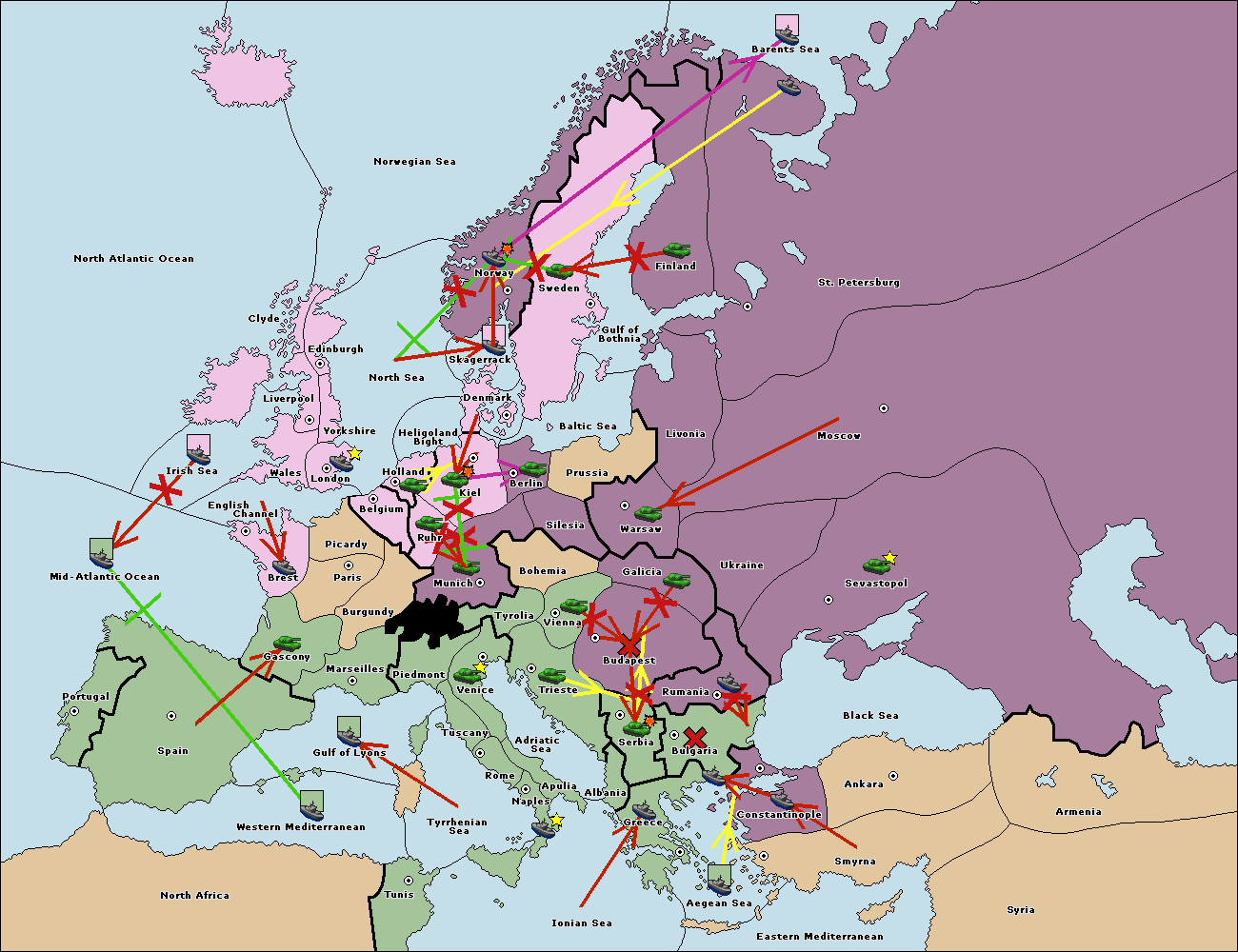 The fleet at Bulgaria (South Coast) support move to Constantinople from Aegean Sea.