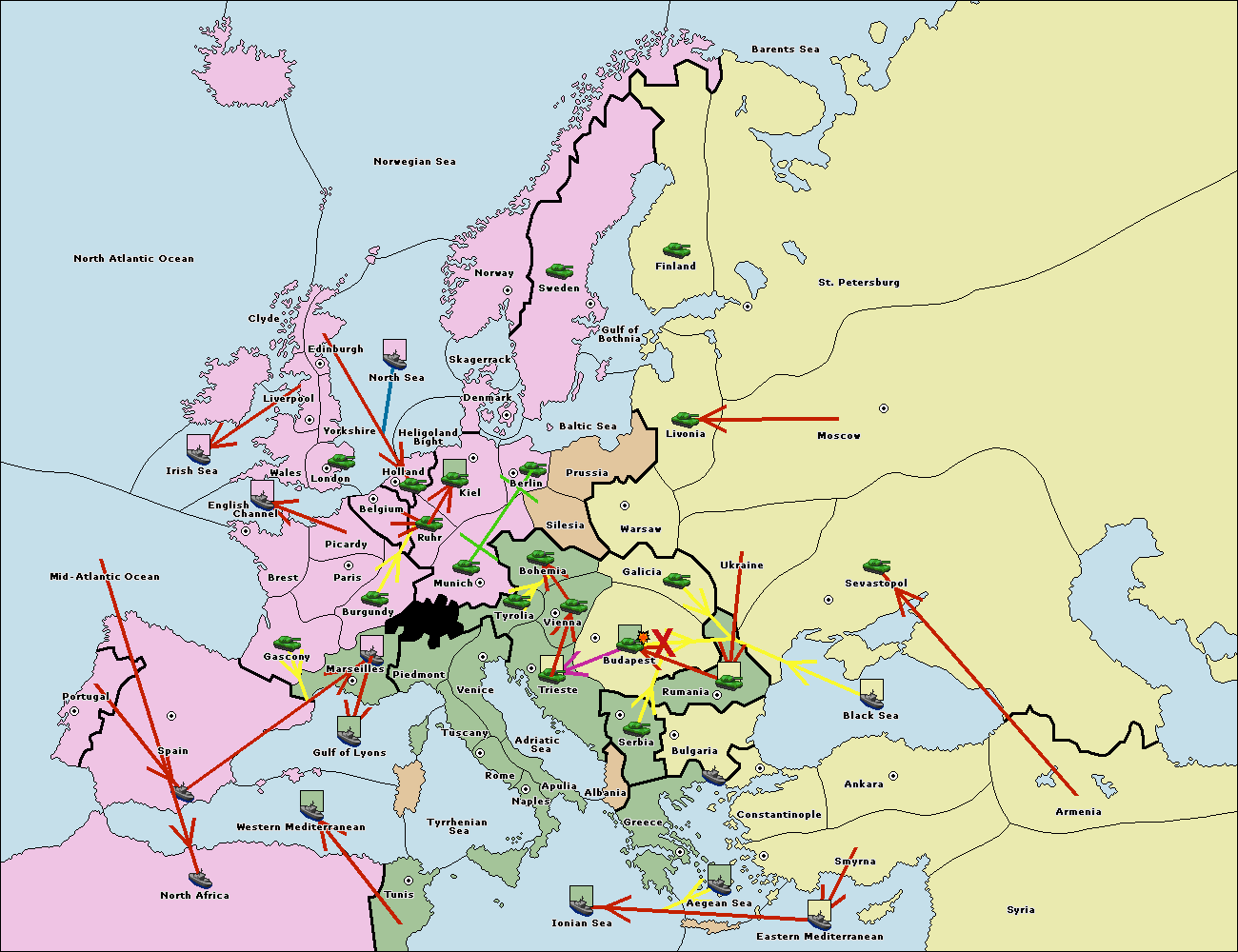 The army at Trieste move to Budapest.