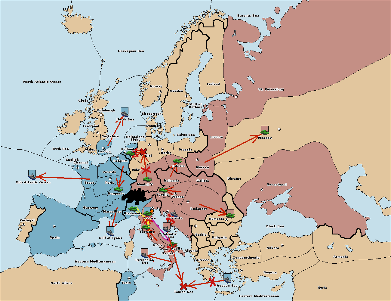The fleet at Gulf of Lyons move to Tyrrhenian Sea.