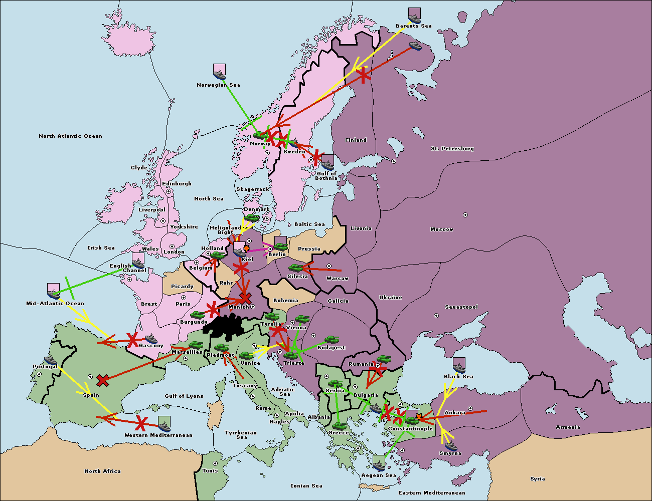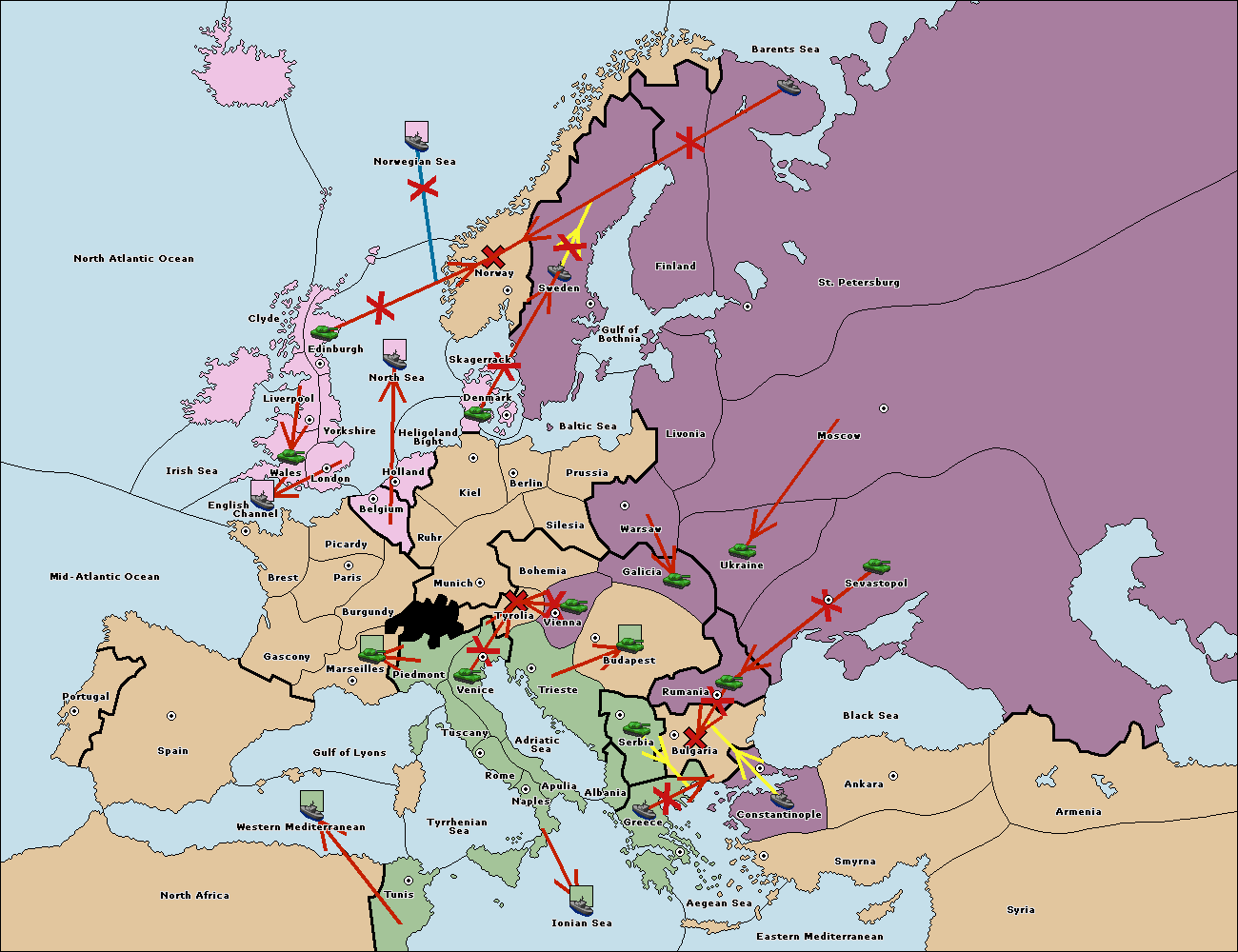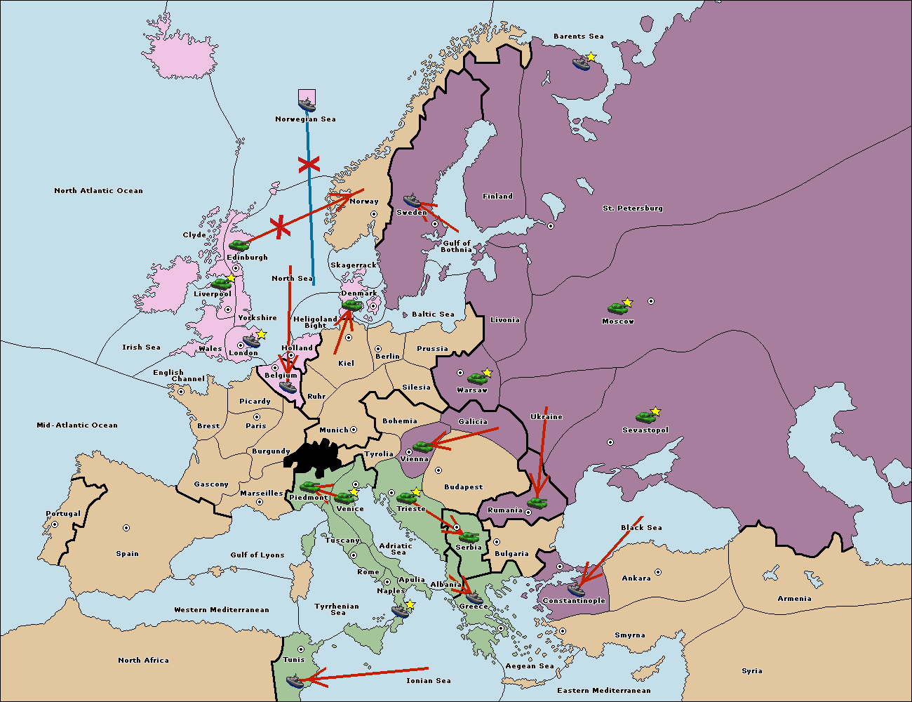 The fleet at Bulgaria (South Coast) support move to Constantinople from Aegean Sea.
