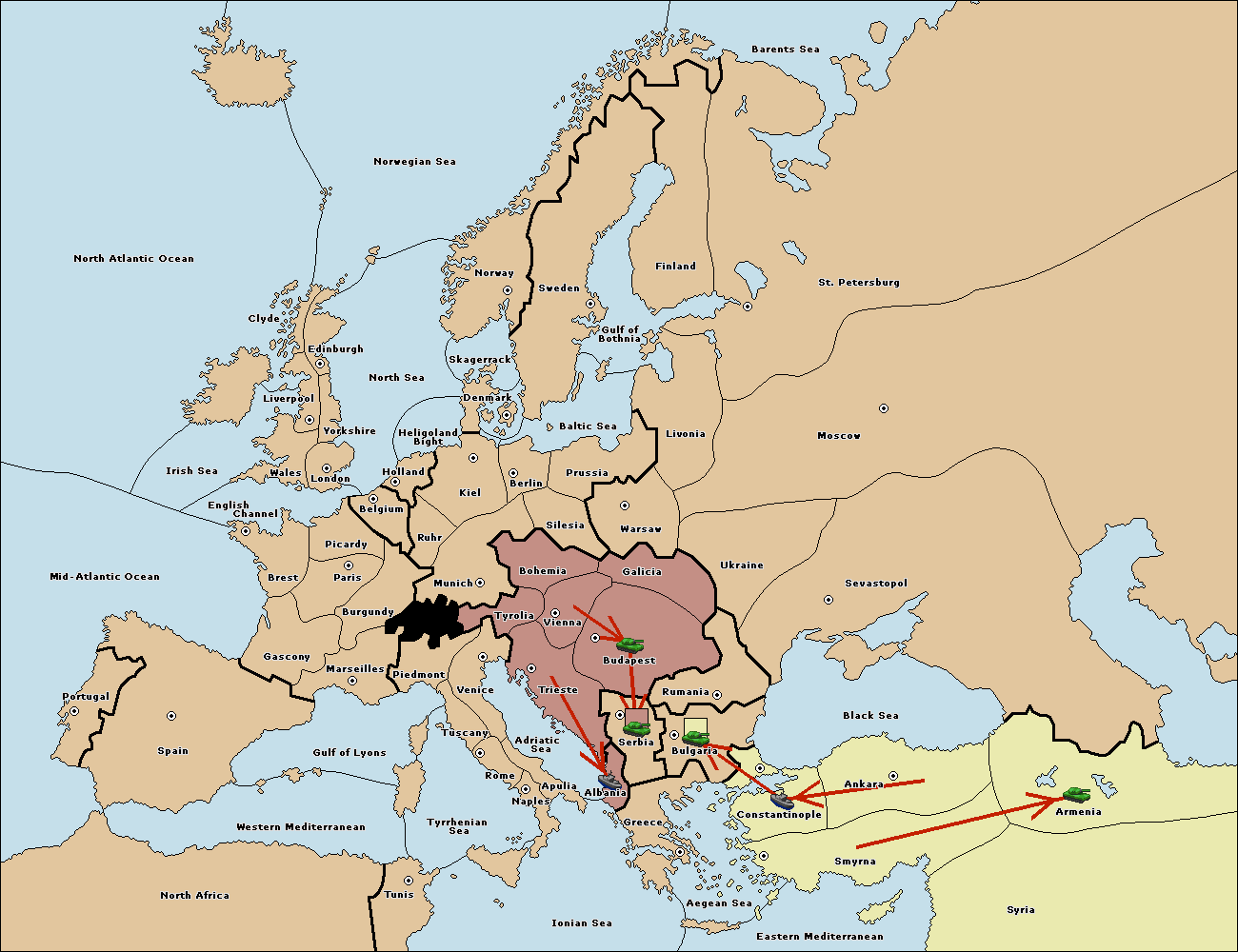The army at Bulgaria support hold to Constantinople.