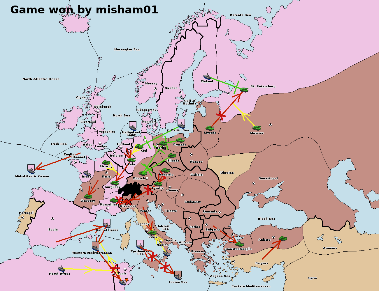 The fleet at Tyrrhenian Sea support move to Tunis from Ionian Sea.