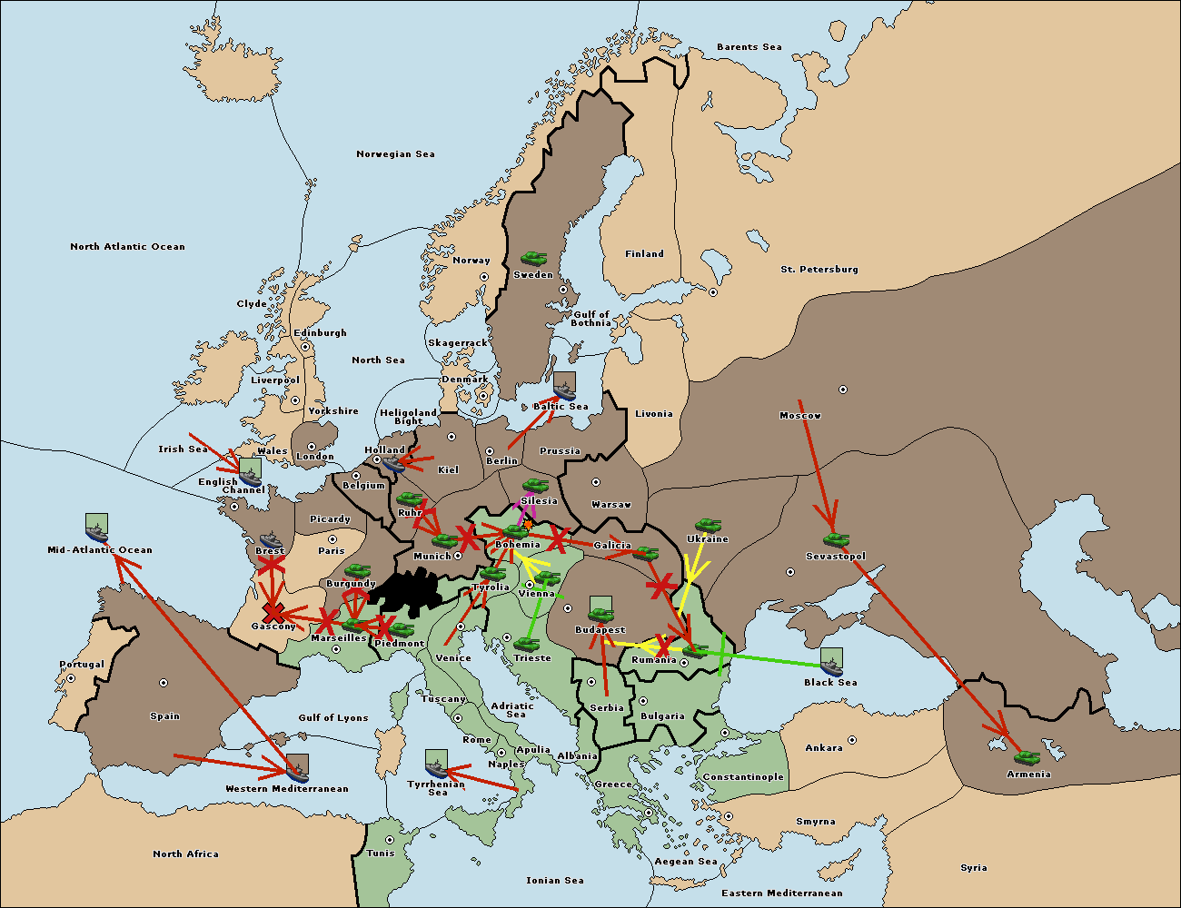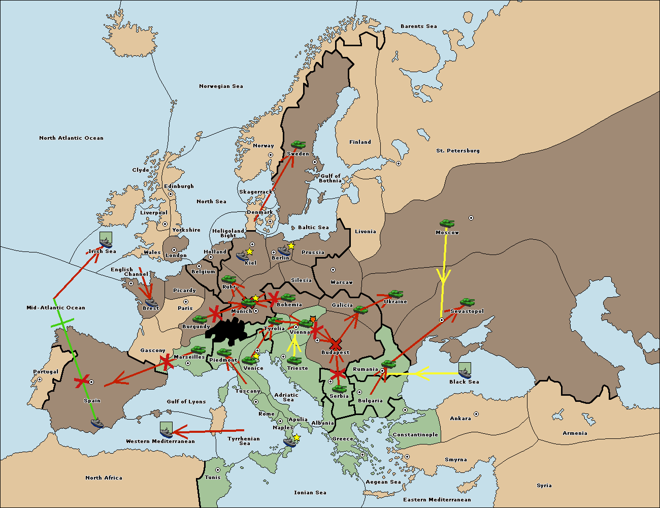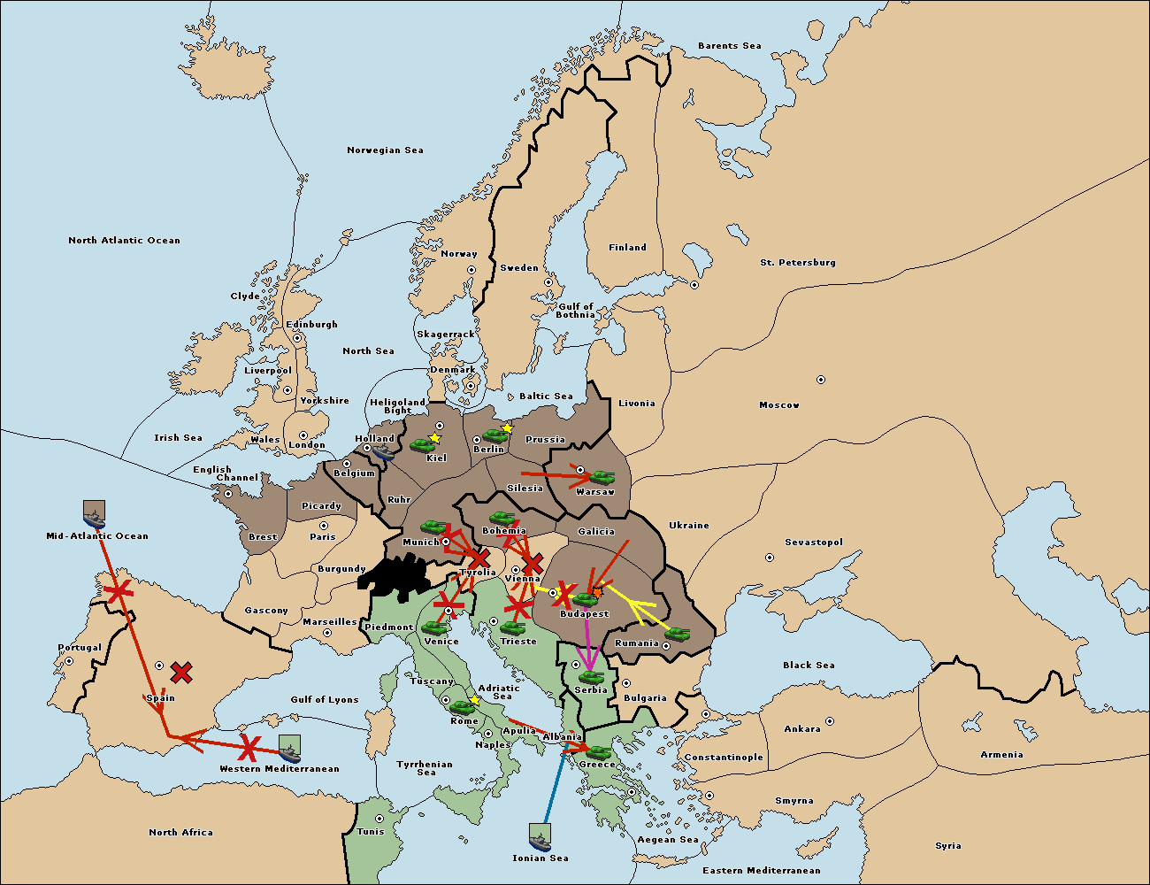 The fleet at Spain (South Coast) support move to Western Mediterranean from Tyrrhenian Sea.