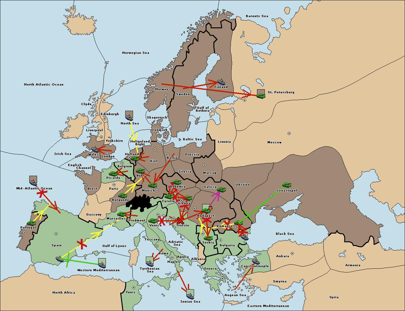 The army at Budapest support move to Vienna from Tyrolia.