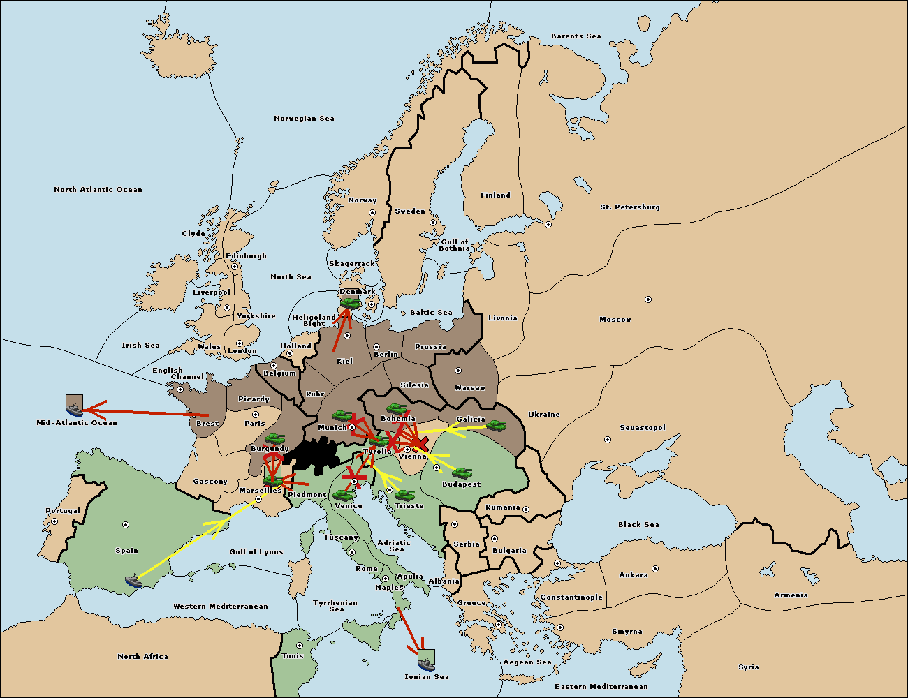 The army at Tyrolia support move to Piedmont from Marseilles.