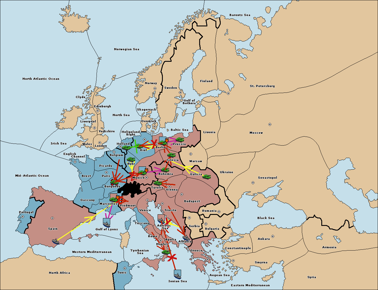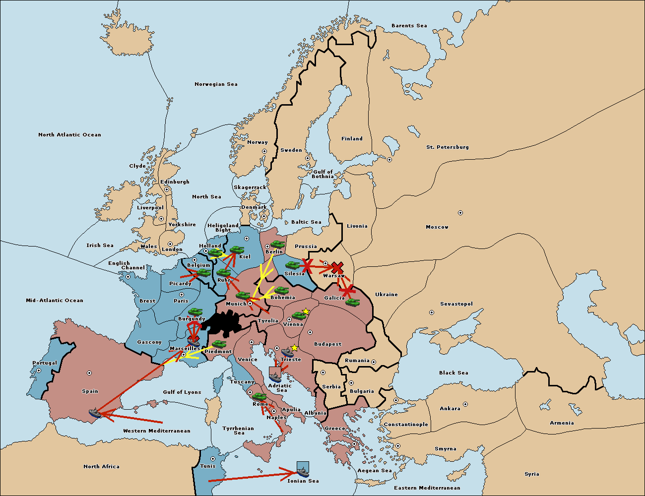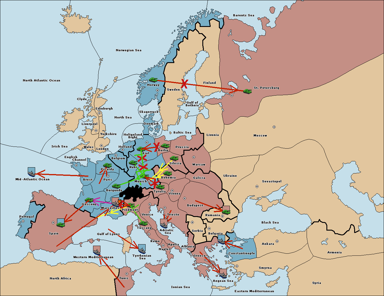 The fleet at Spain (South Coast) support move to Marseilles from Piedmont.