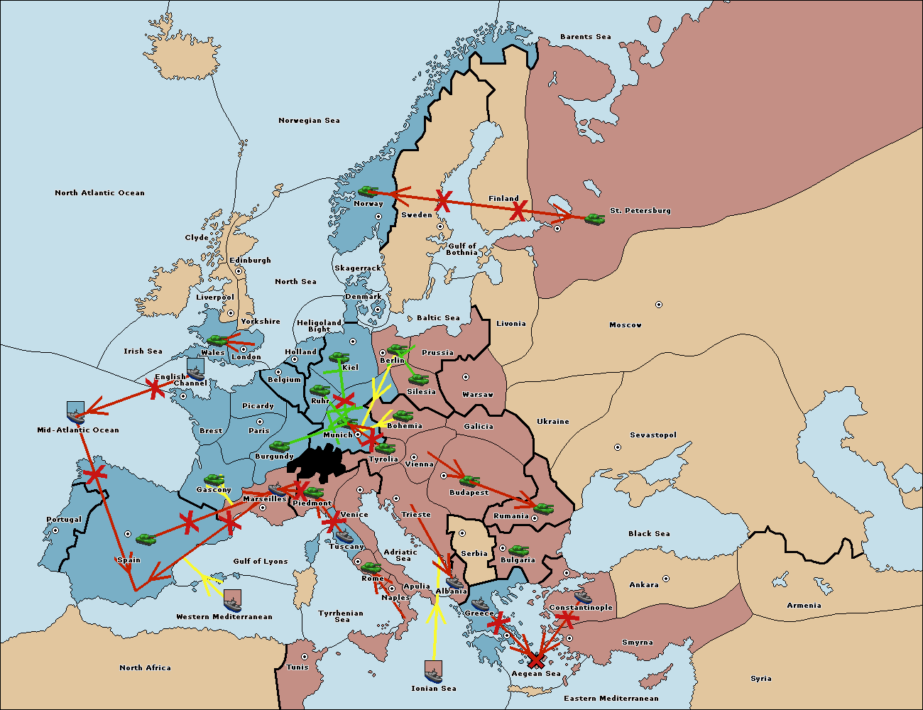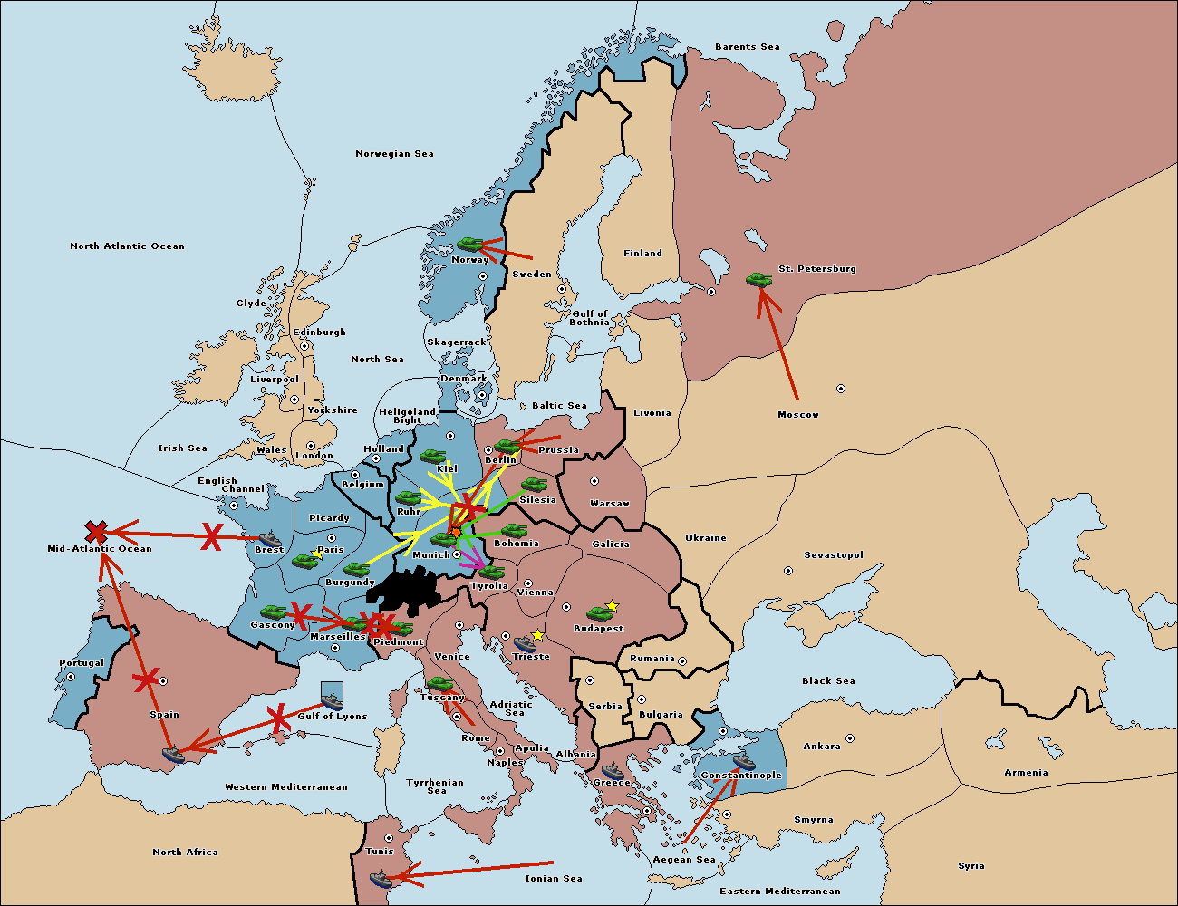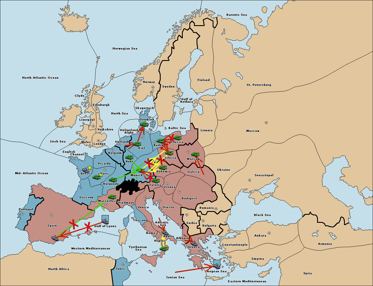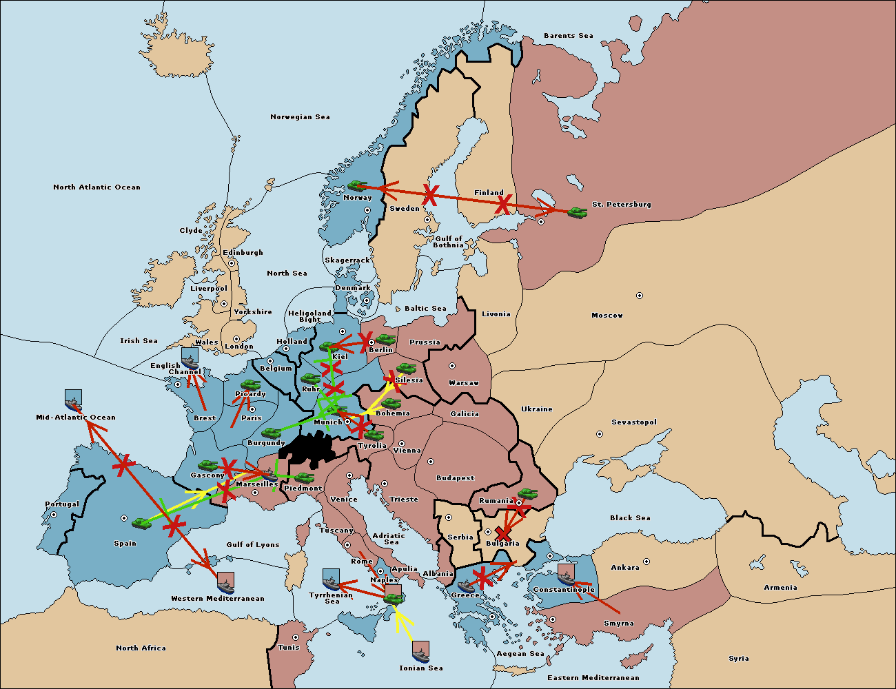 The fleet at Spain (South Coast) support move to Marseilles from Piedmont.