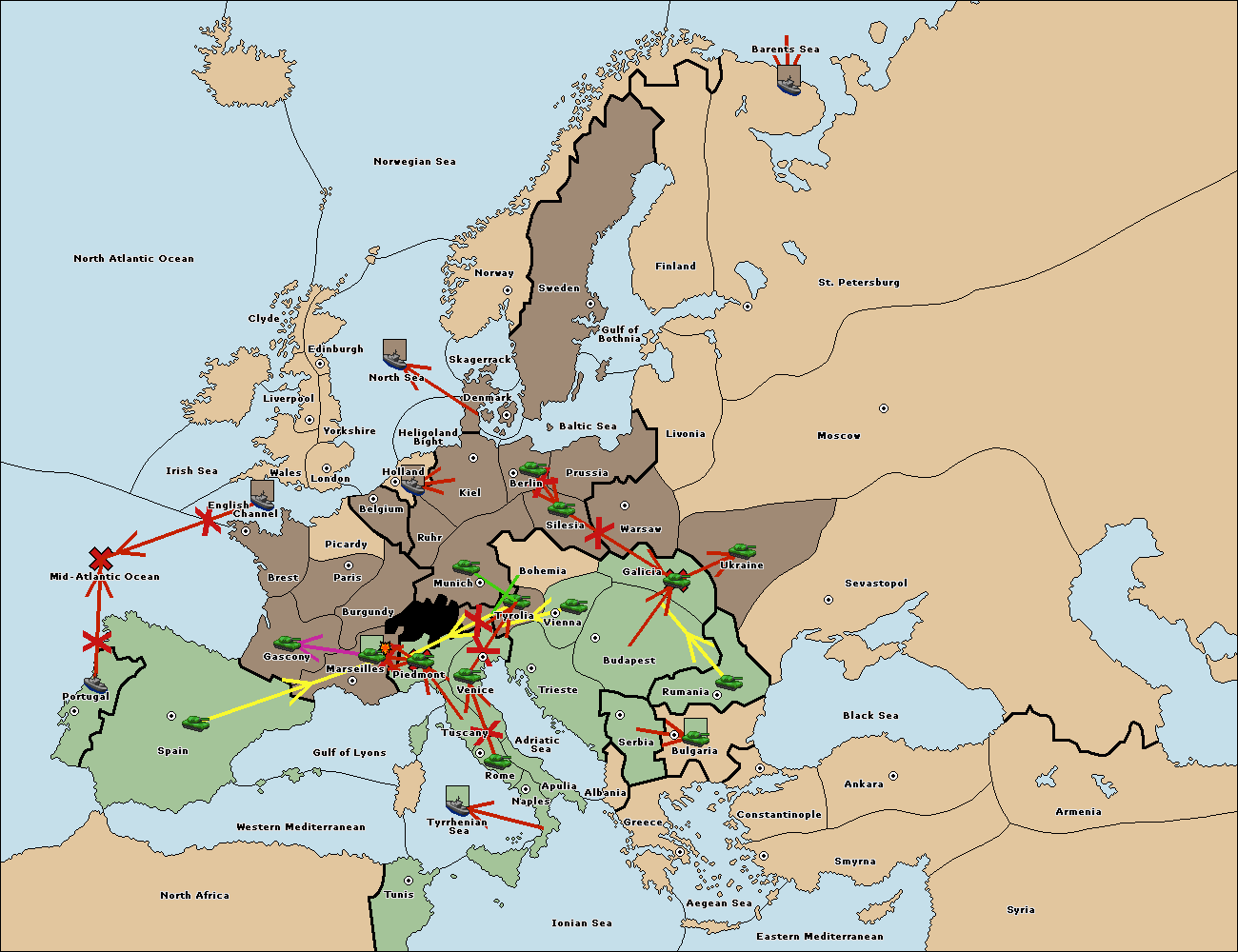 The army at Tyrolia support move to Piedmont from Marseilles.