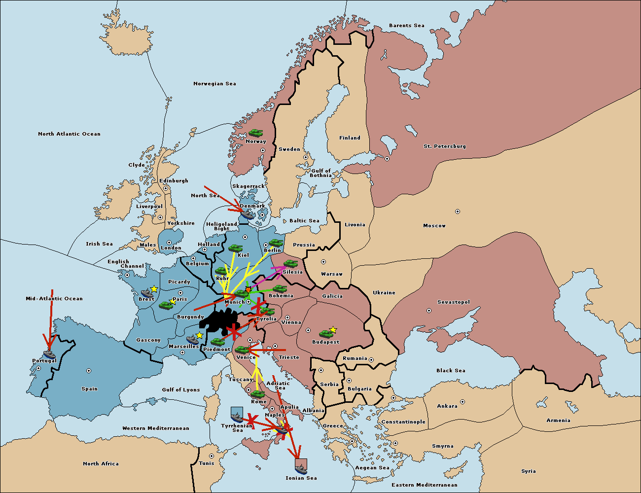 The army at Munich support move to Tyrolia from Piedmont.