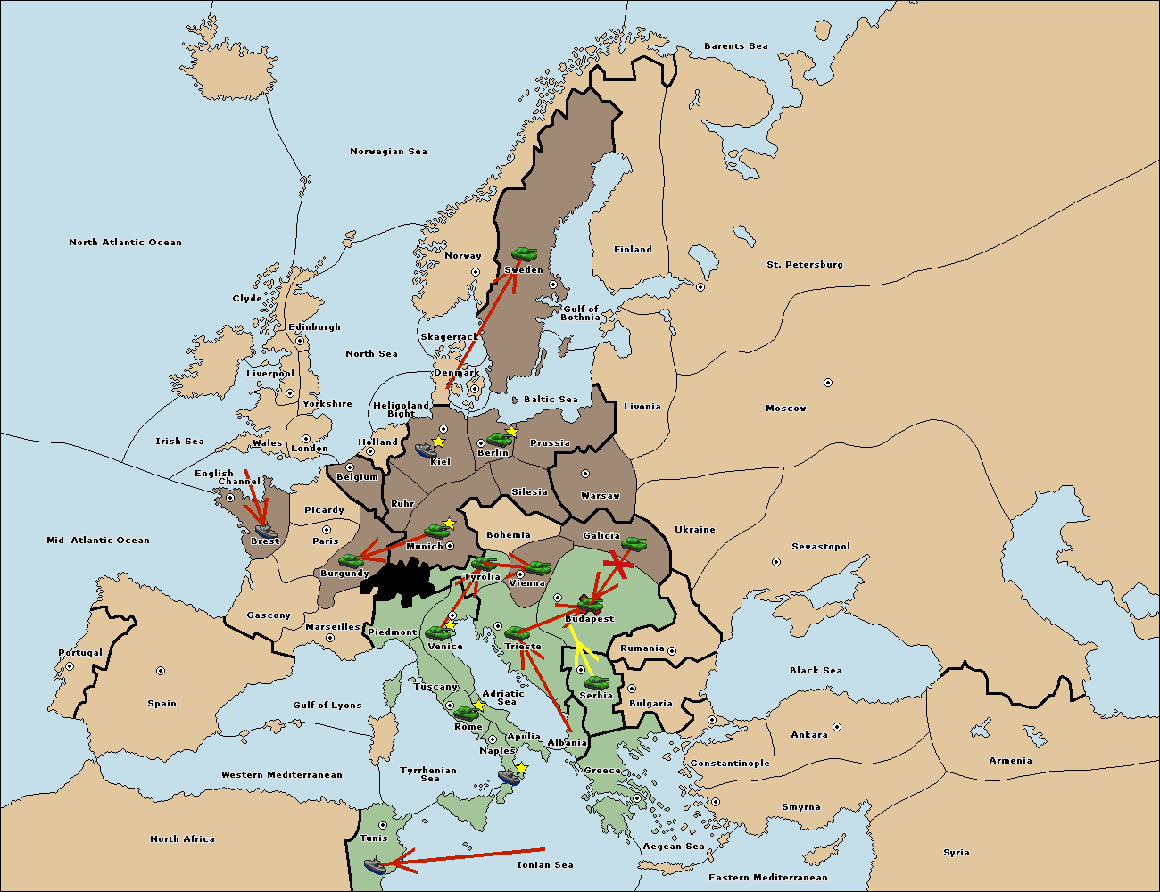 The army at Trieste move to Budapest.