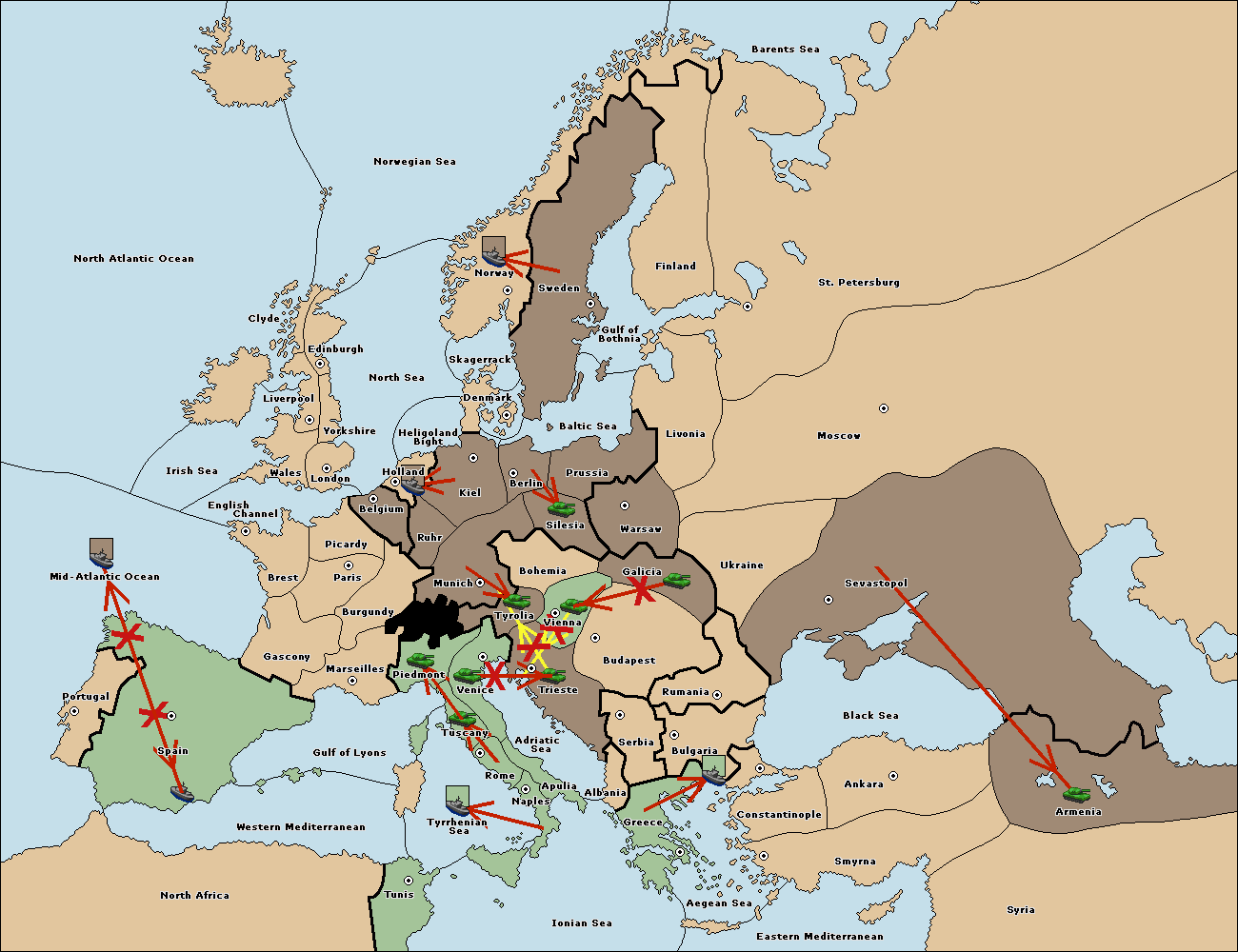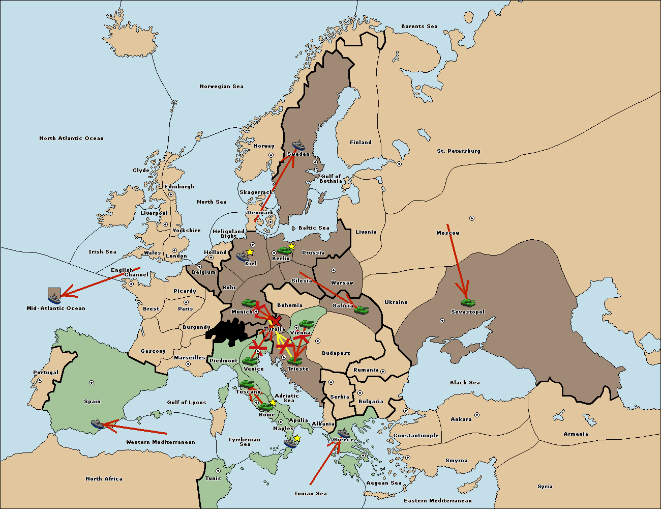 The army at Trieste support move to Tyrolia from Munich.