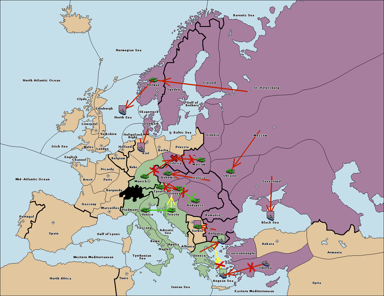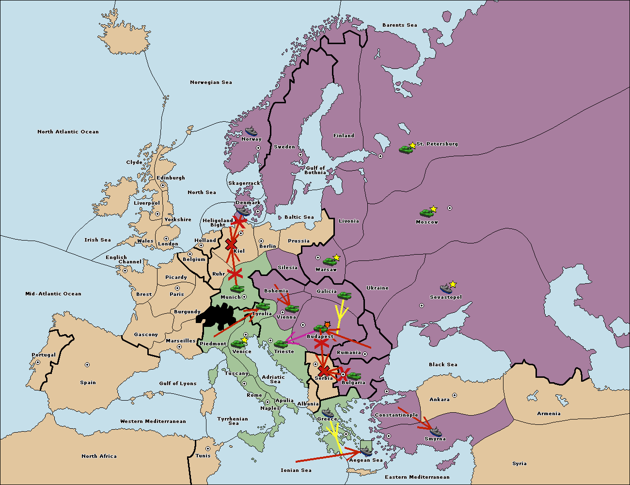 The fleet at Bulgaria (South Coast) support move to Constantinople from Aegean Sea.
