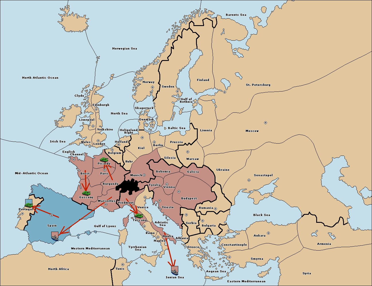 The fleet at Mid-Atlantic Ocean move to Western Mediterranean.