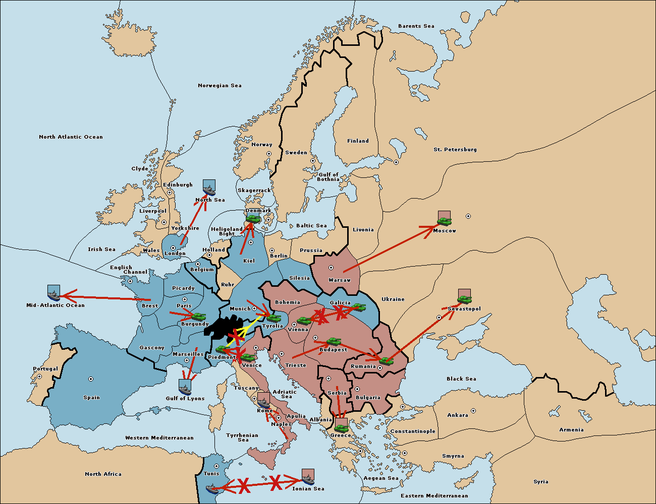 The army at Munich support move to Tyrolia from Piedmont.