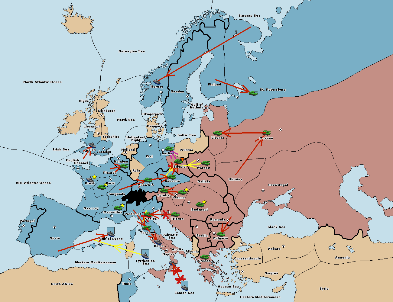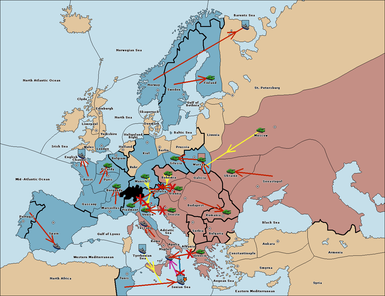 The fleet at Tyrrhenian Sea support move to Gulf of Lyons from Spain.