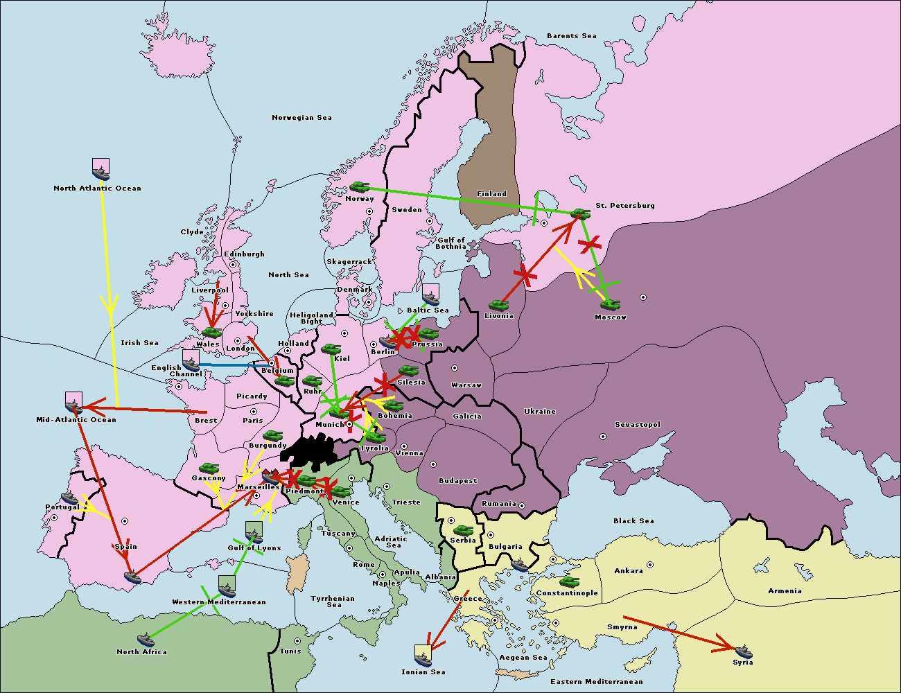 The fleet at Greece support move to Bulgaria from Constantinople.