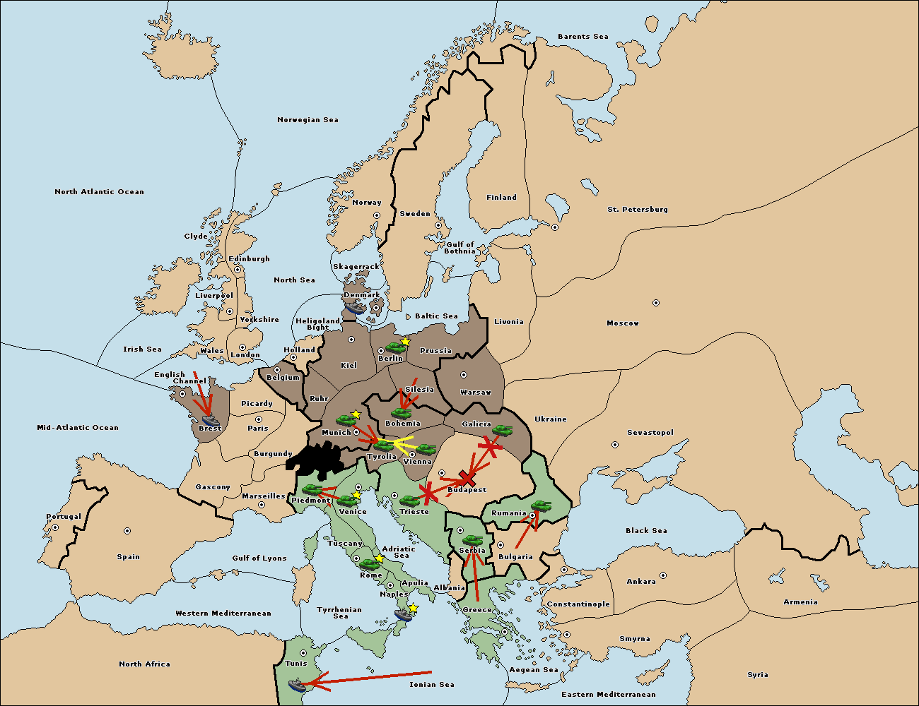 The army at Budapest support move to Vienna from Tyrolia.