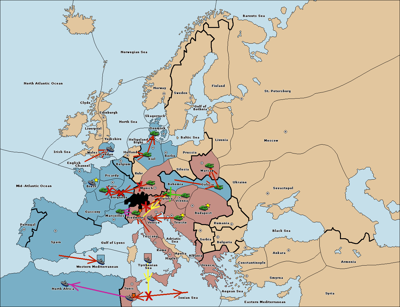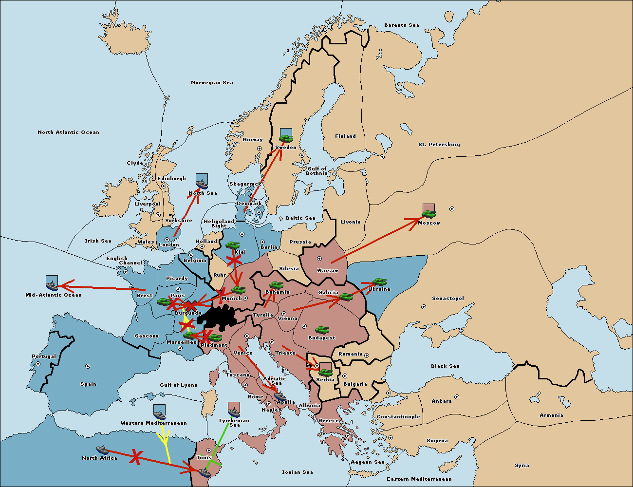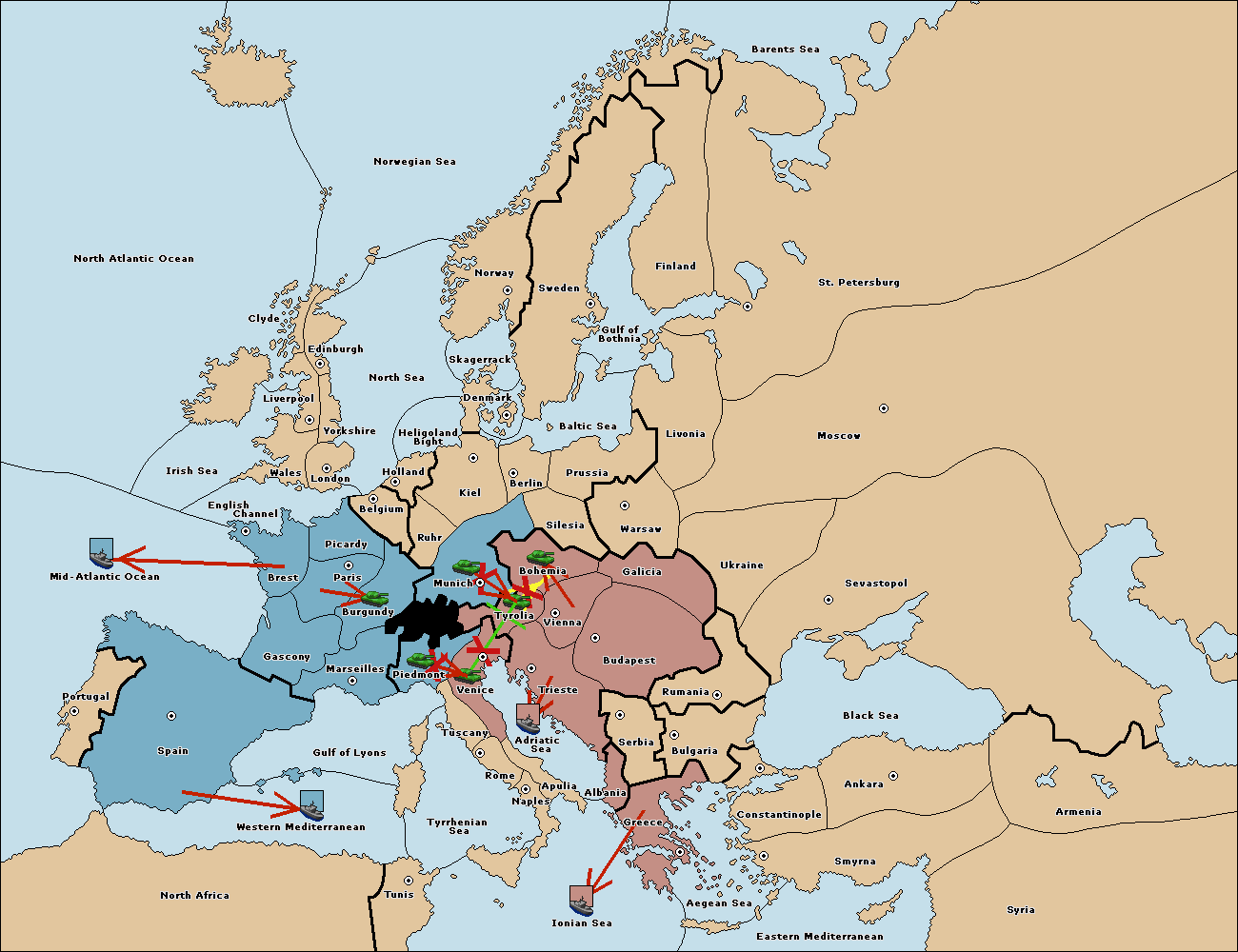 The fleet at Mid-Atlantic Ocean move to Western Mediterranean.