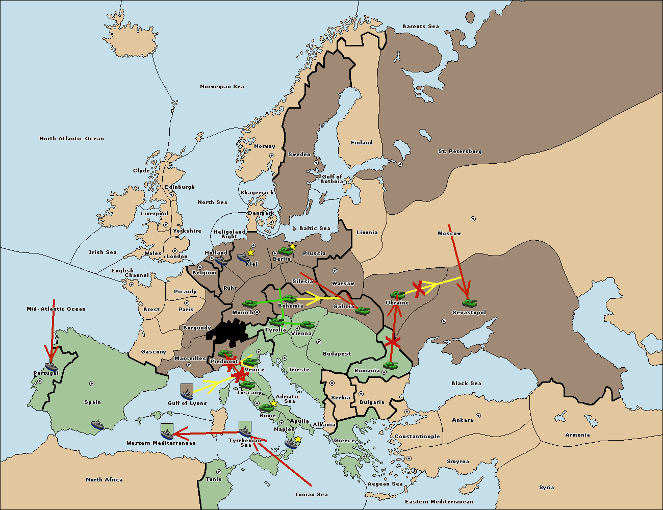 The fleet at Spain (South Coast) support move to Gulf of Lyons from Tyrrhenian Sea.