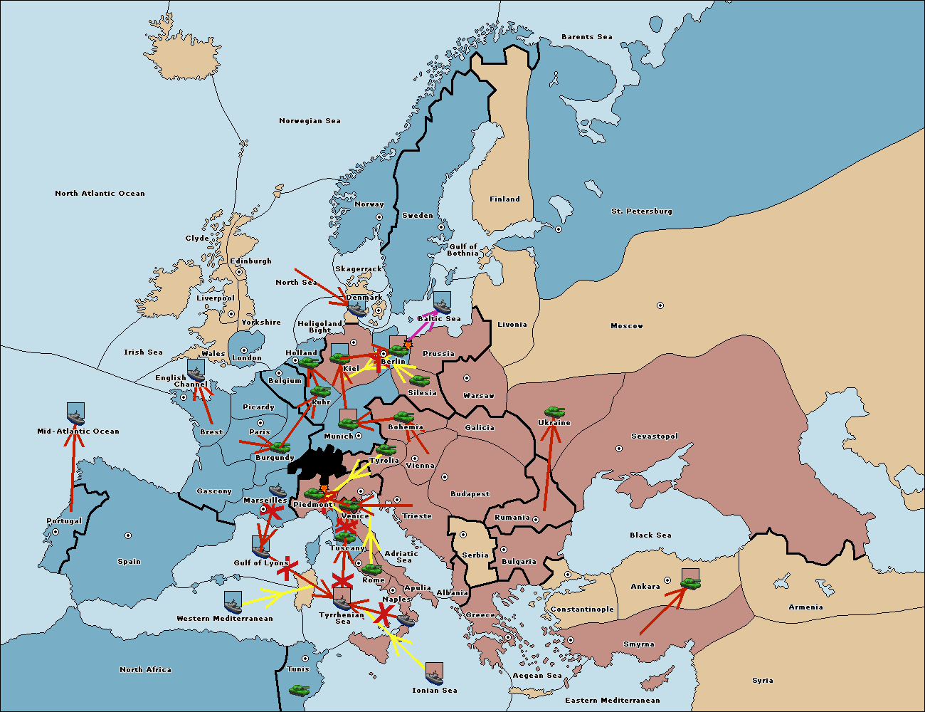 The fleet at Mid-Atlantic Ocean support move to Western Mediterranean from Gulf of Lyons.