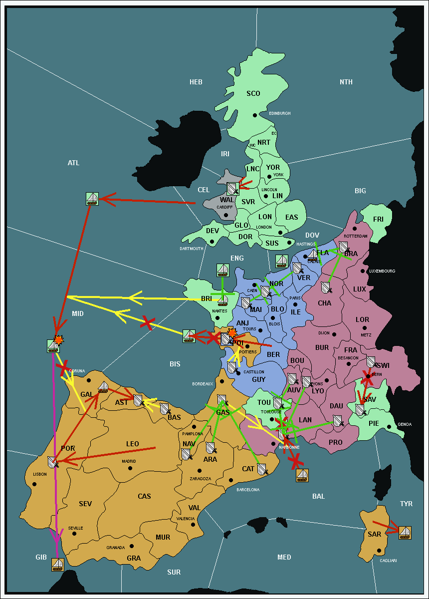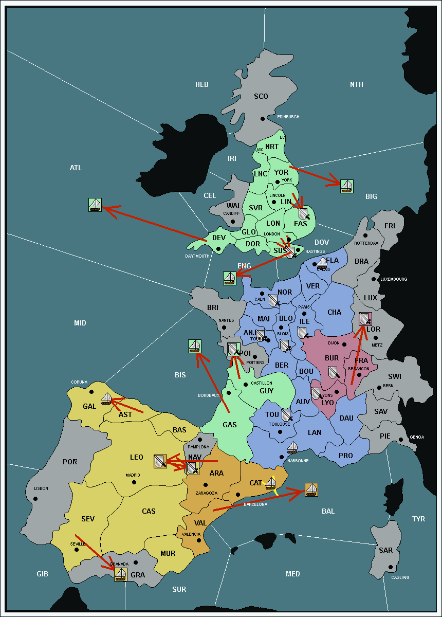The fleet at Bay of Biscay (BIS) support move to Galicia (GAL) from Mid-Atlantic (MID).