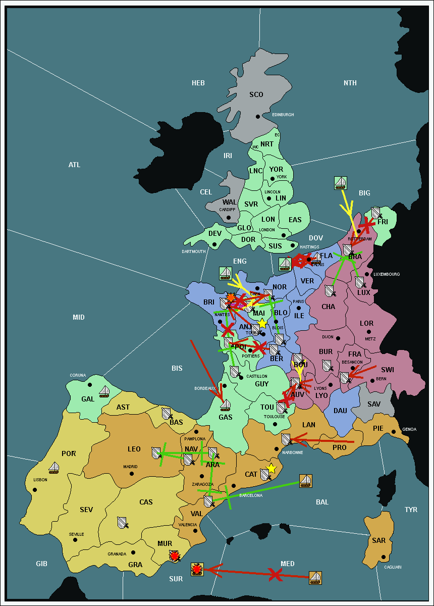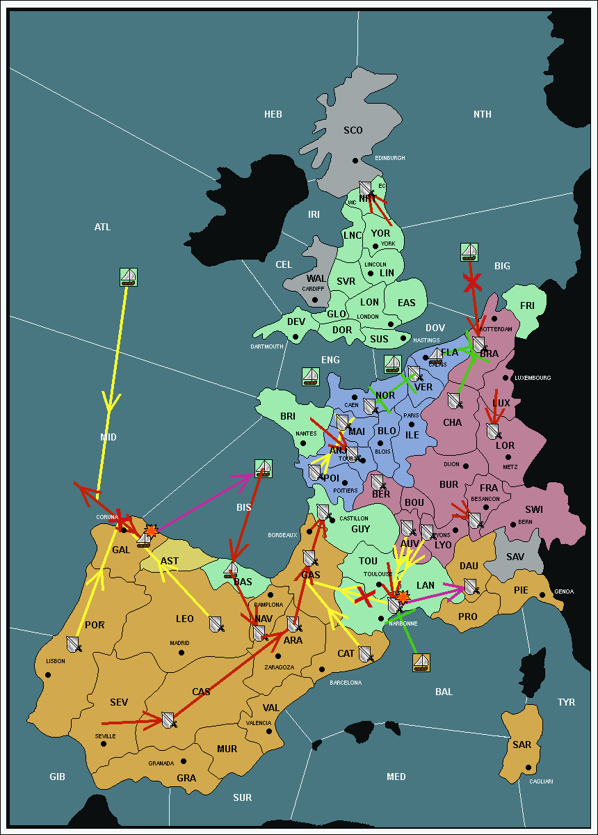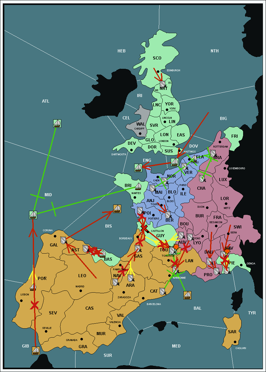 The army at Gascony (GAS) support move to Languedoc (LAN) from Catalonia (CAT).