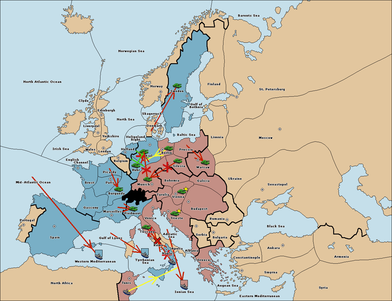 The fleet at Ionian Sea support move to Tyrrhenian Sea from Tunis.