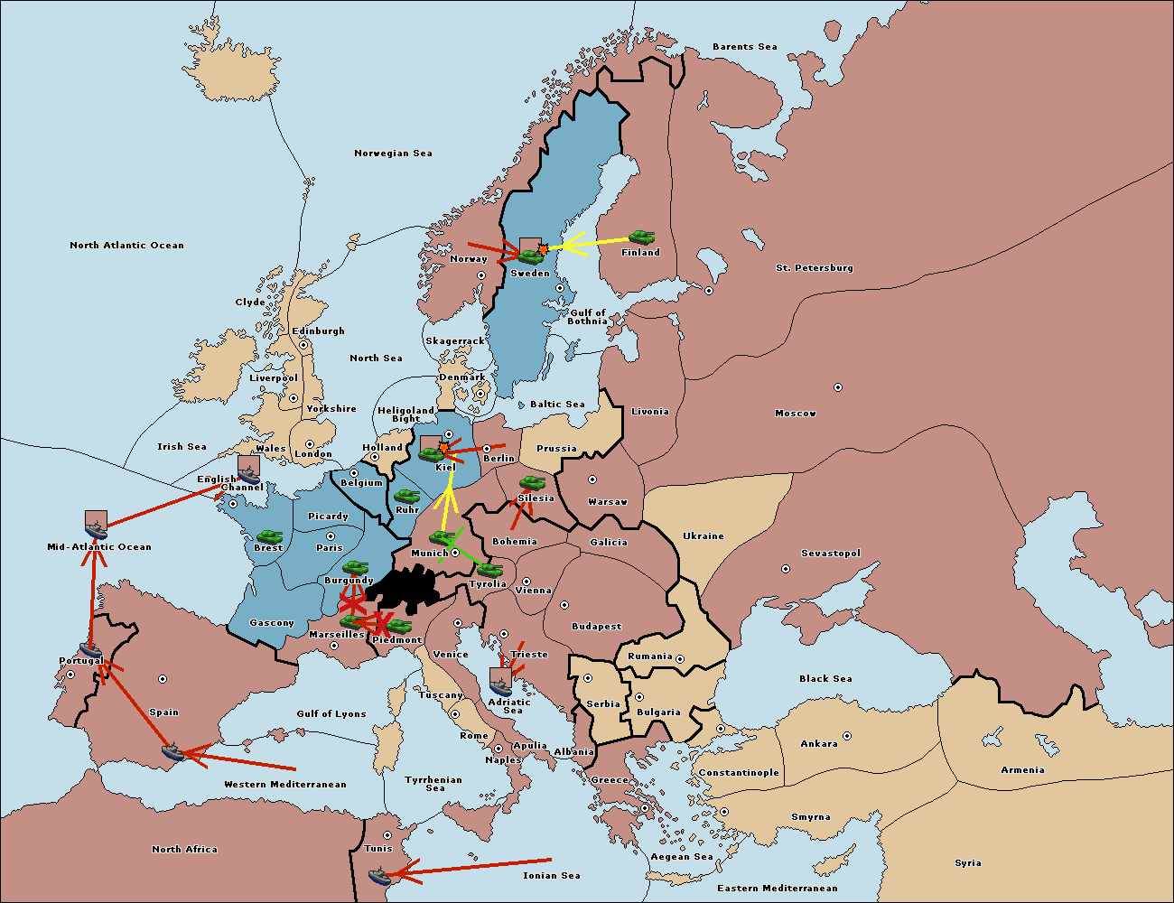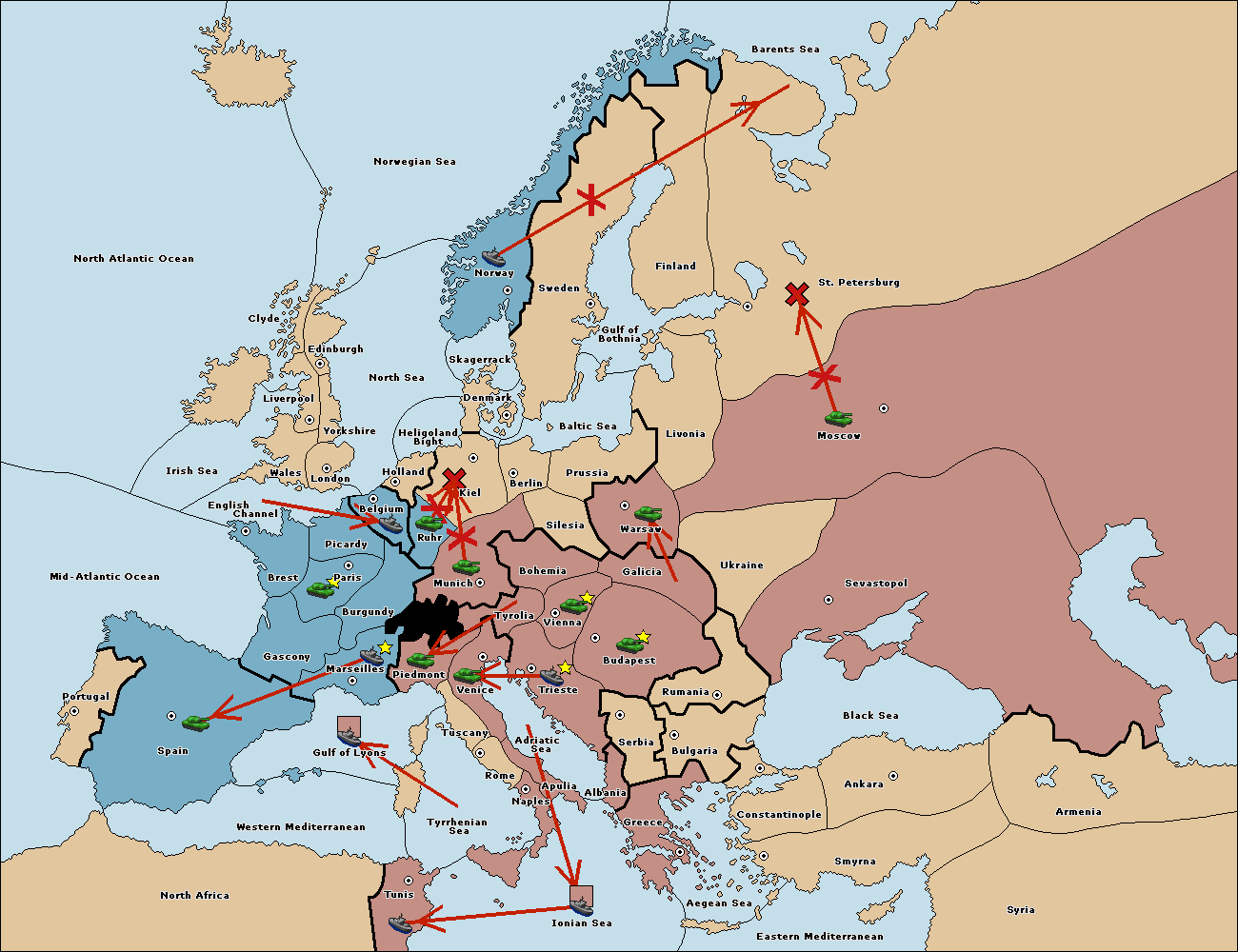The fleet at Gulf of Lyons support move to Marseilles from Piedmont.