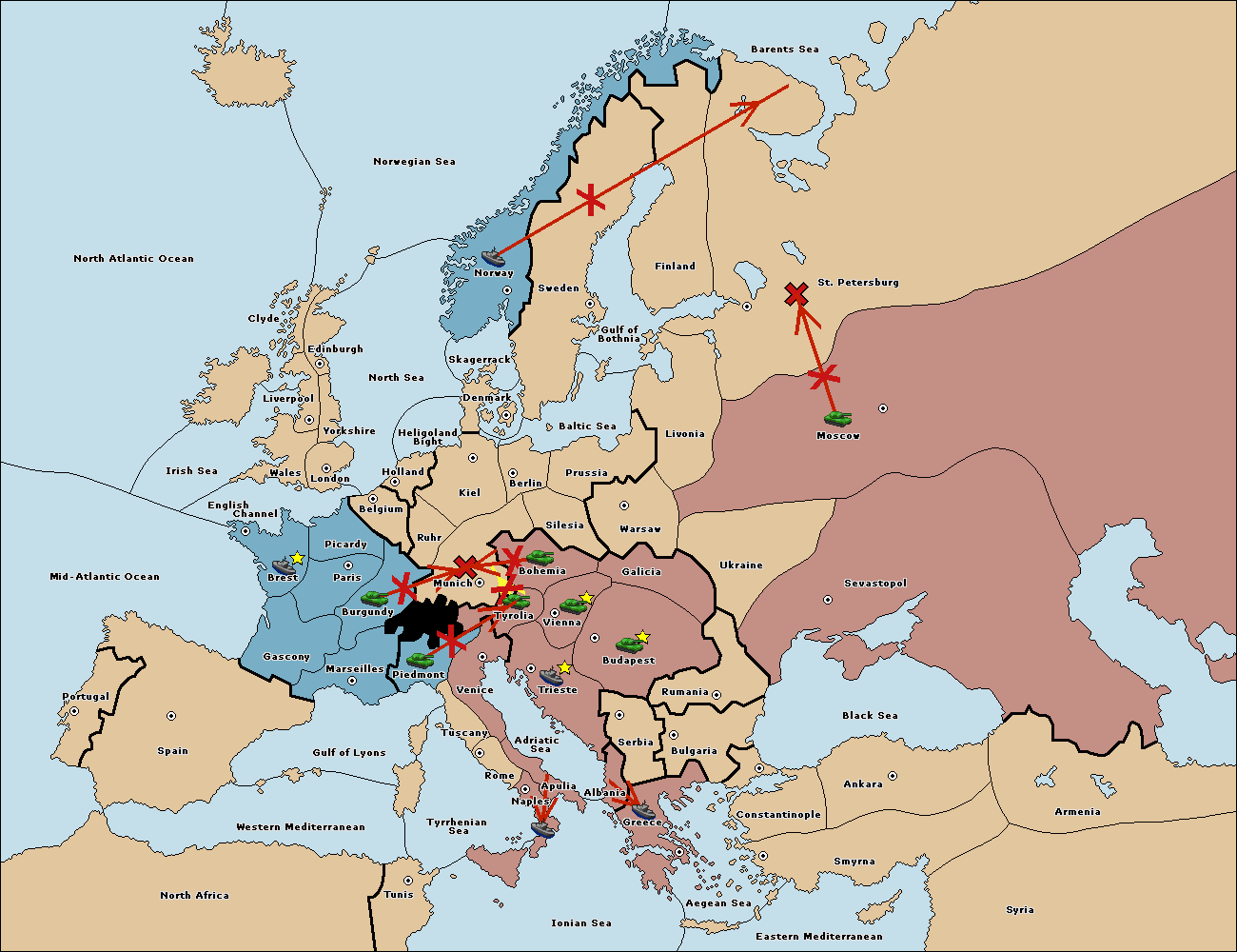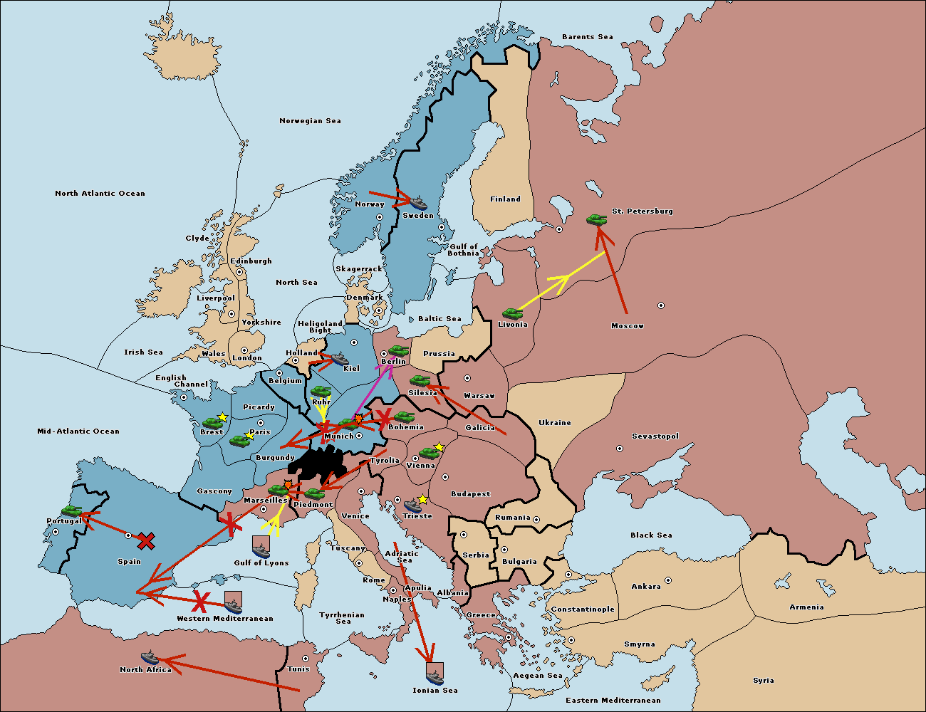 The fleet at North Africa move to Mid-Atlantic Ocean.