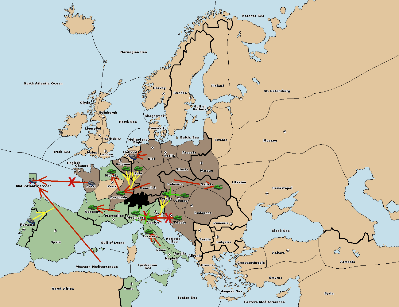 The army at Trieste support move to Tyrolia from Munich.