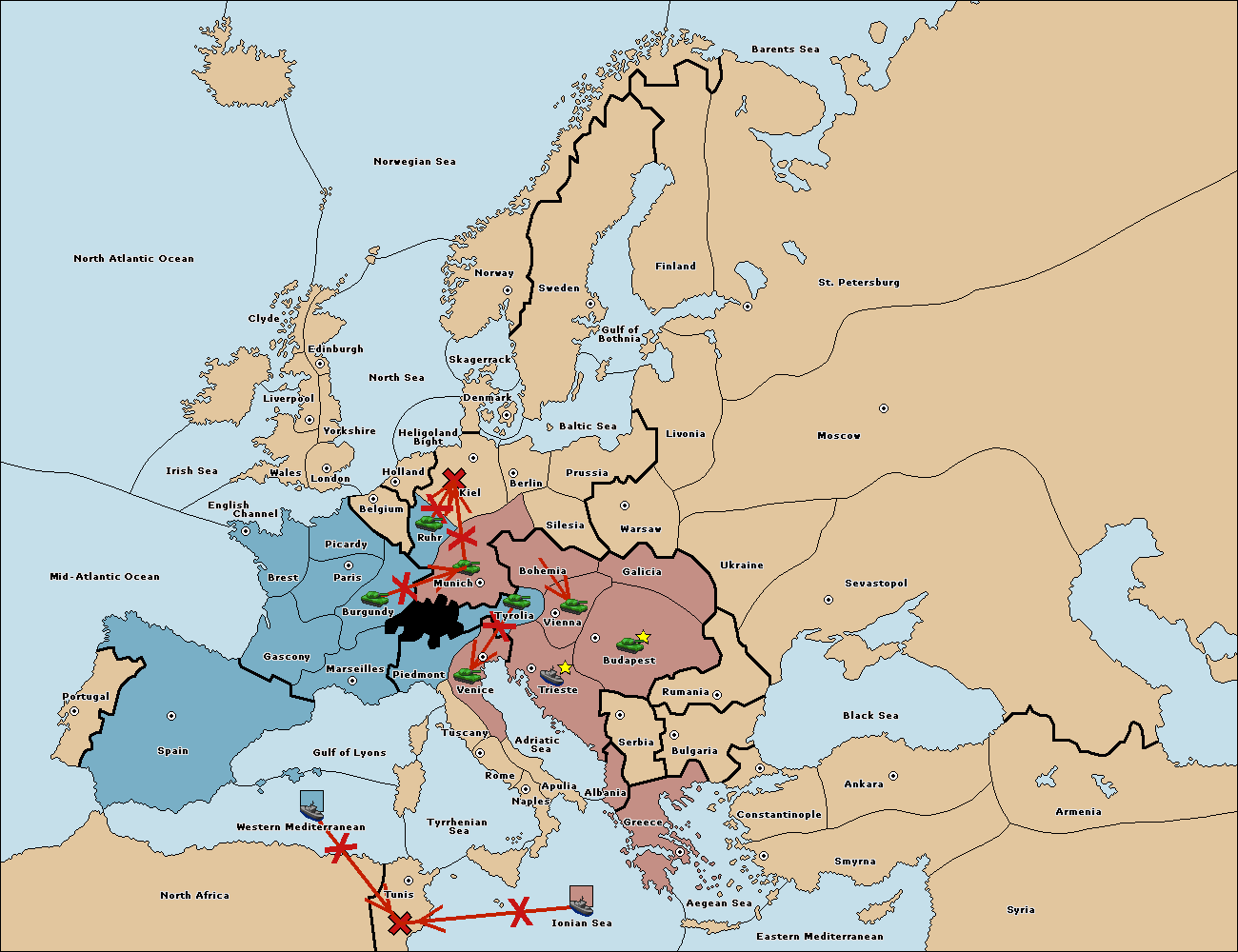The fleet at Tyrrhenian Sea support move to Tunis from Ionian Sea.