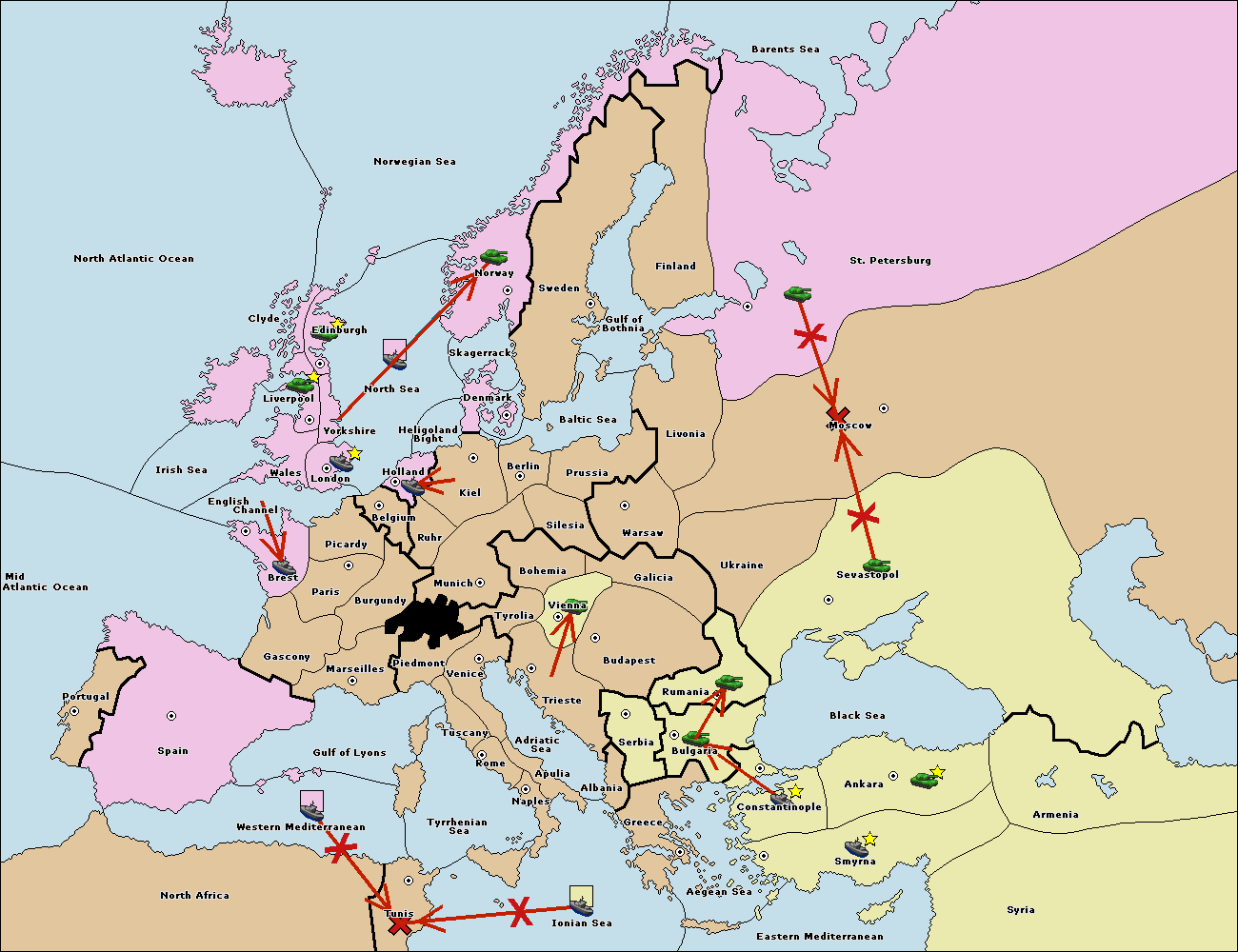 The army at Warsaw support move to Moscow from Sevastopol.
