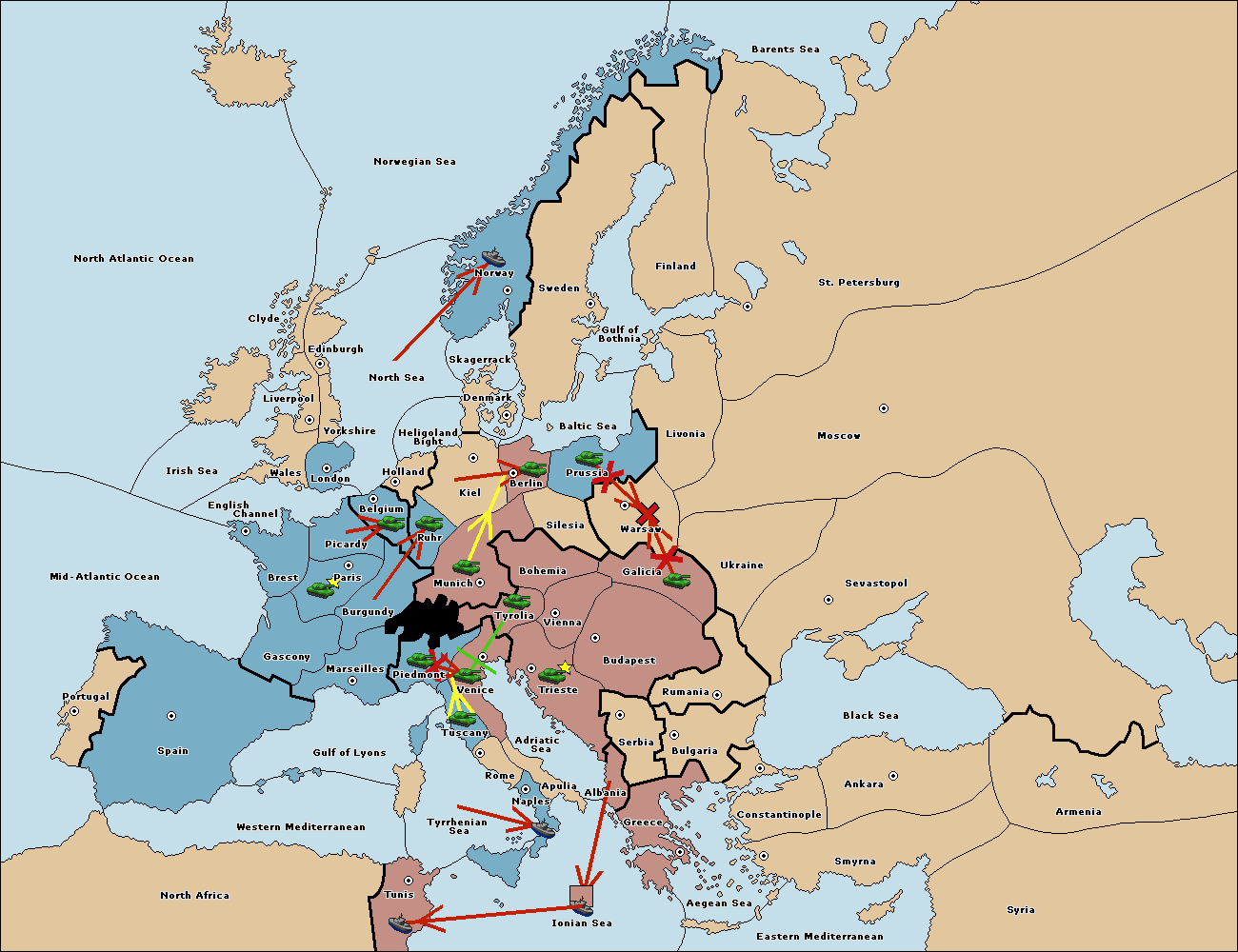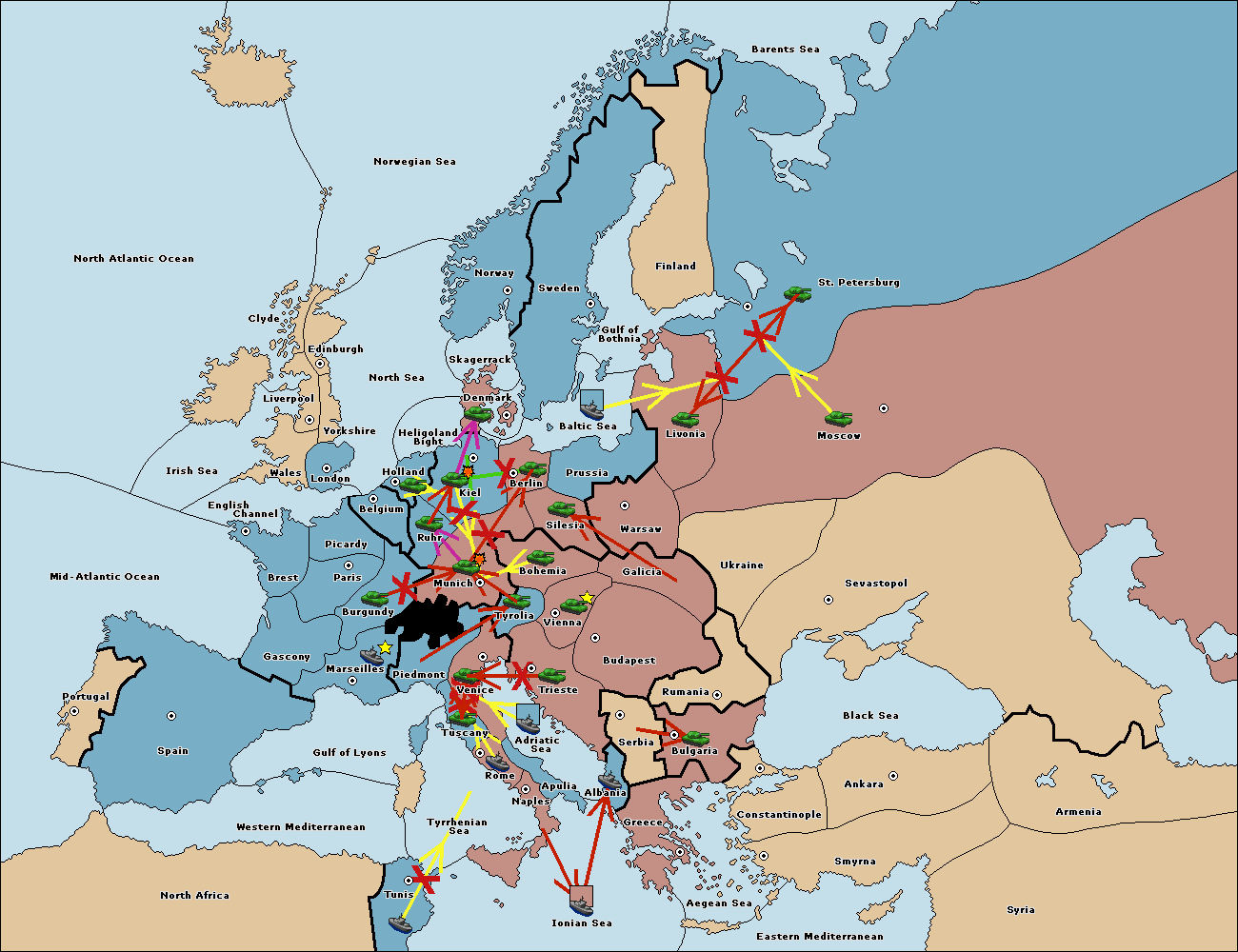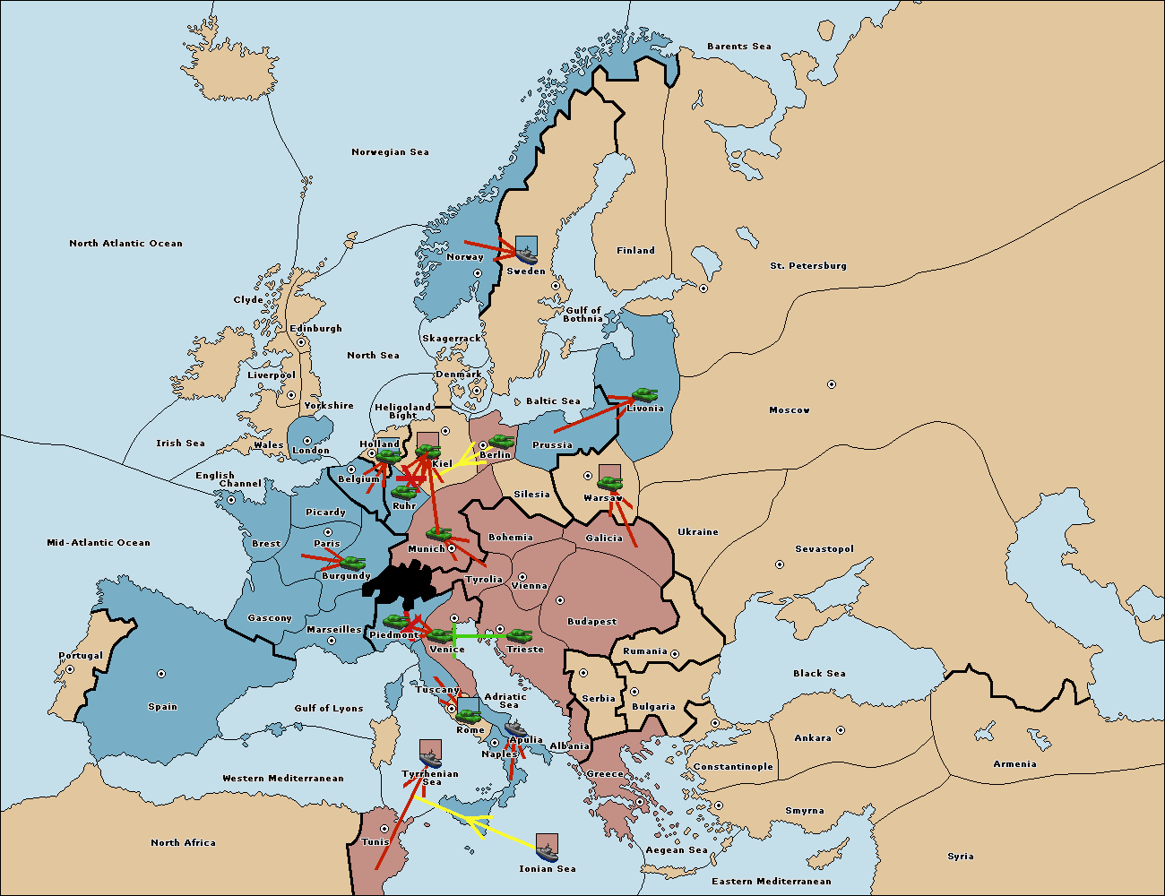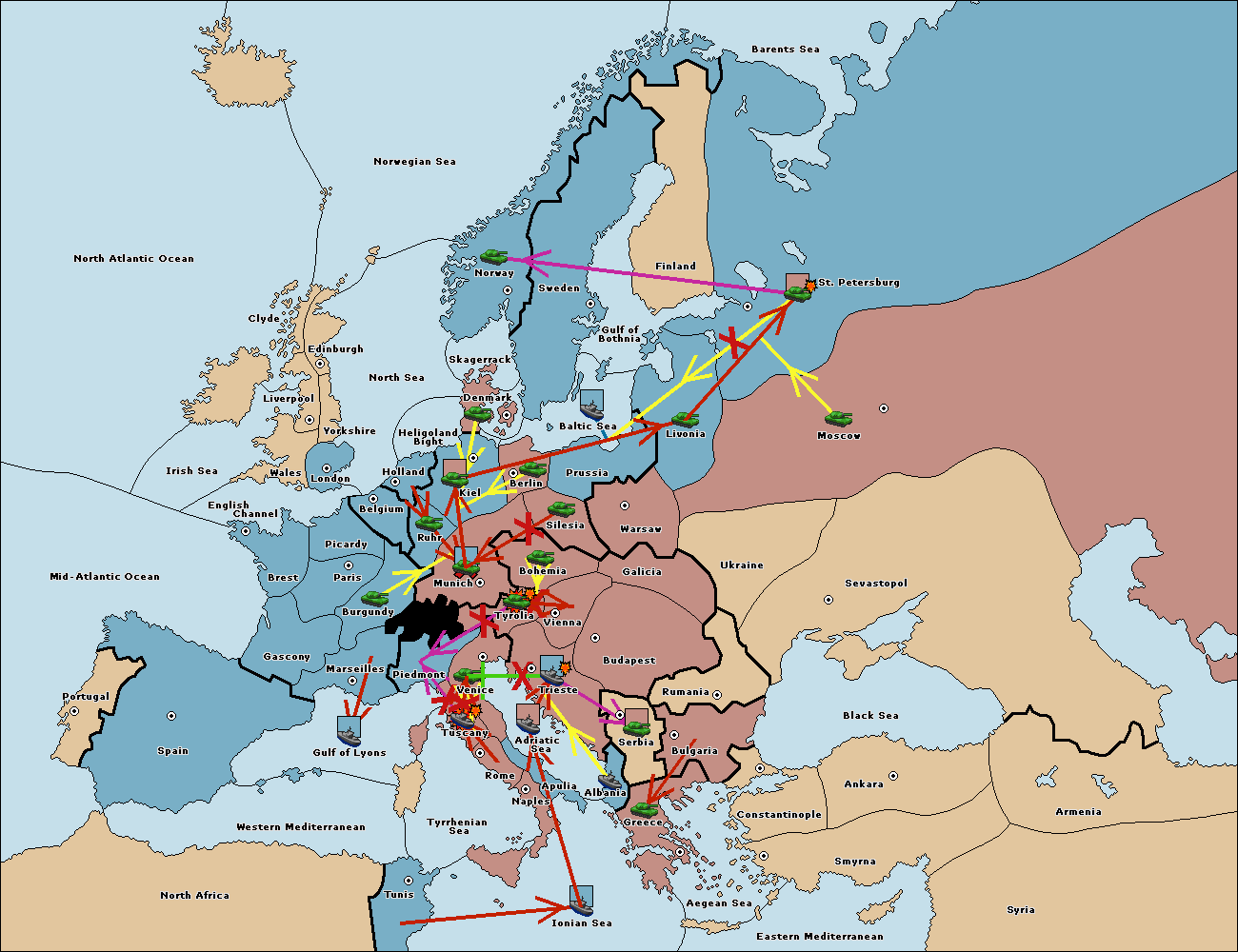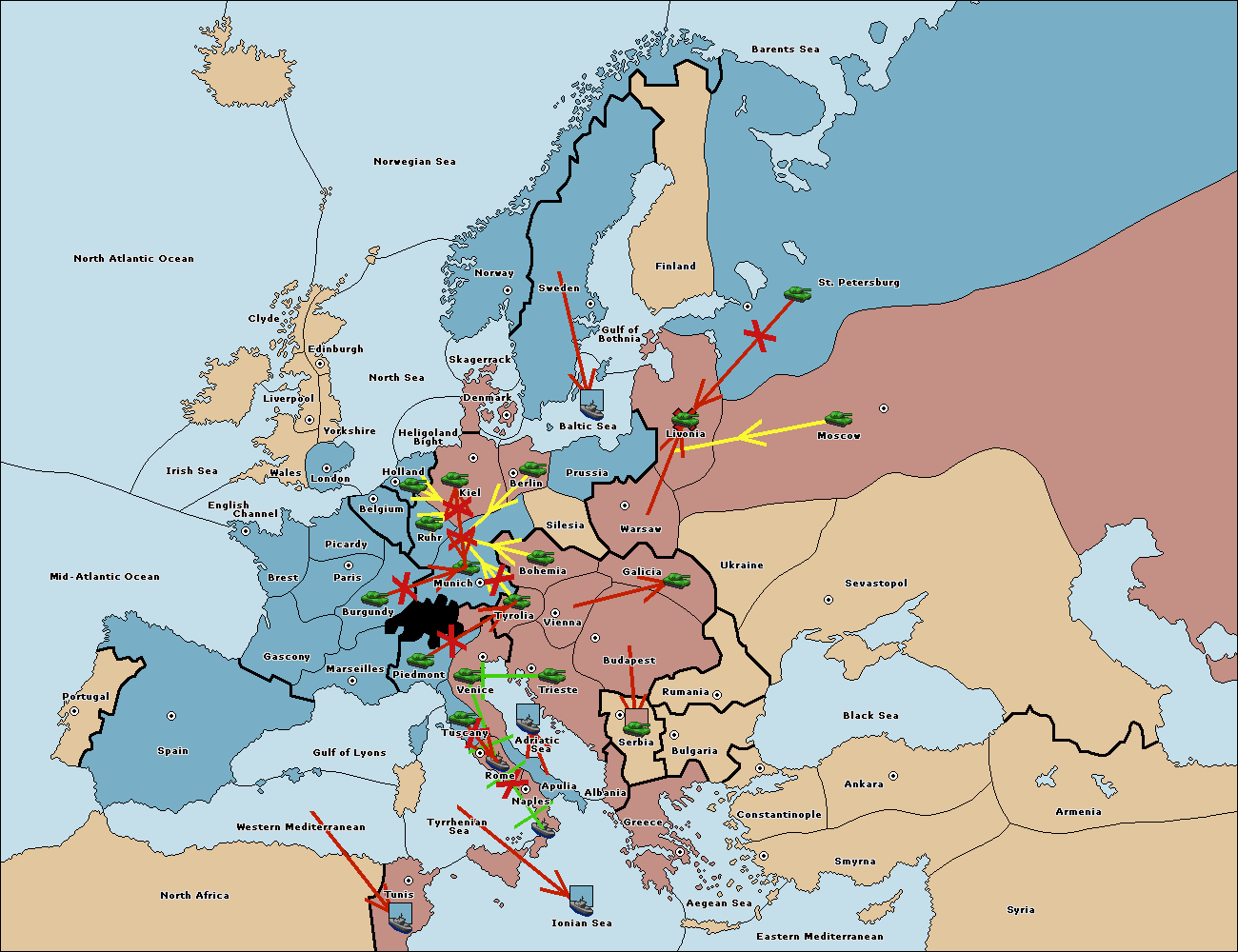 The fleet at Ionian Sea support move to Tyrrhenian Sea from Tunis.