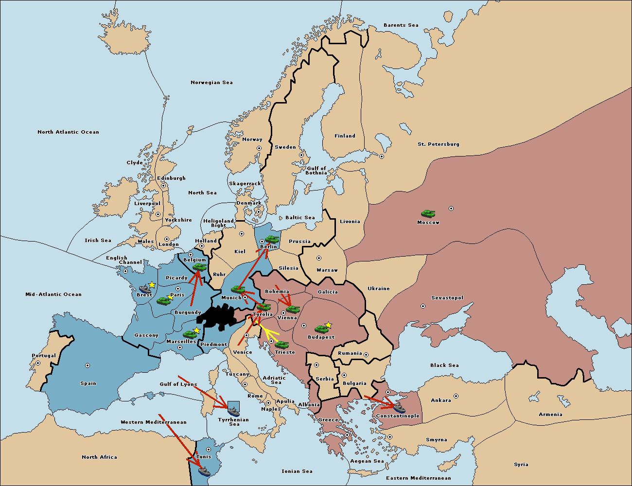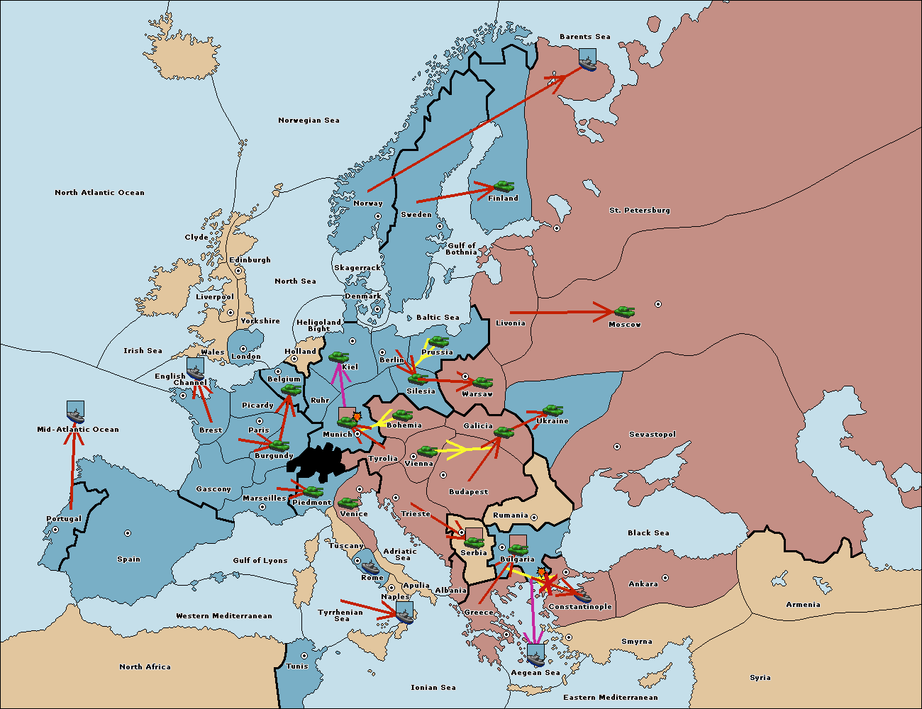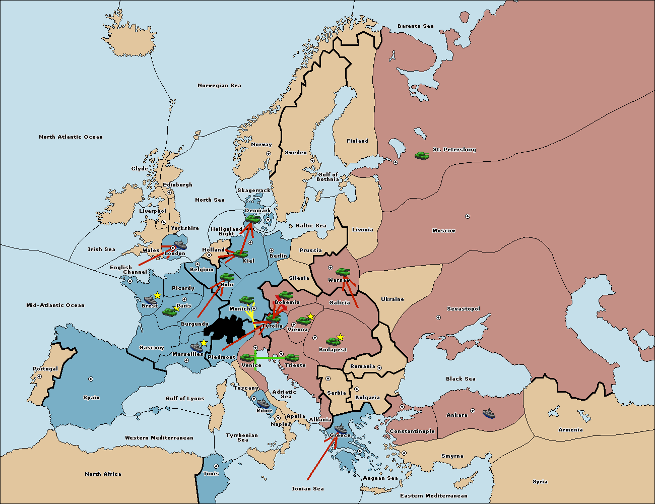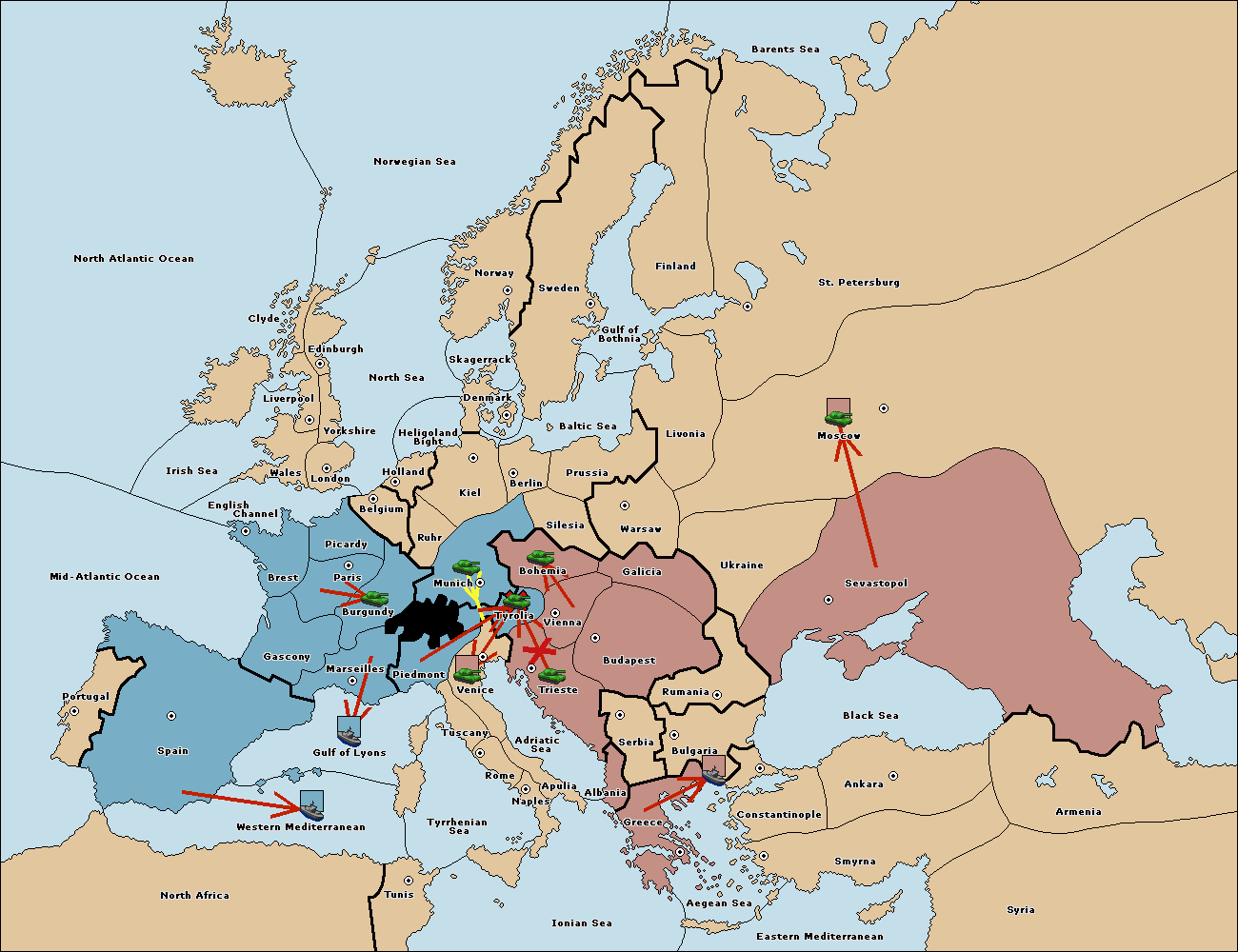 The fleet at Bulgaria (South Coast) move to Constantinople.