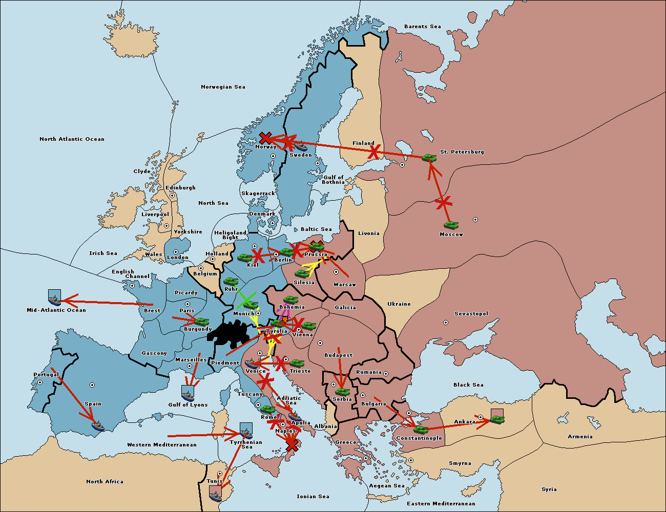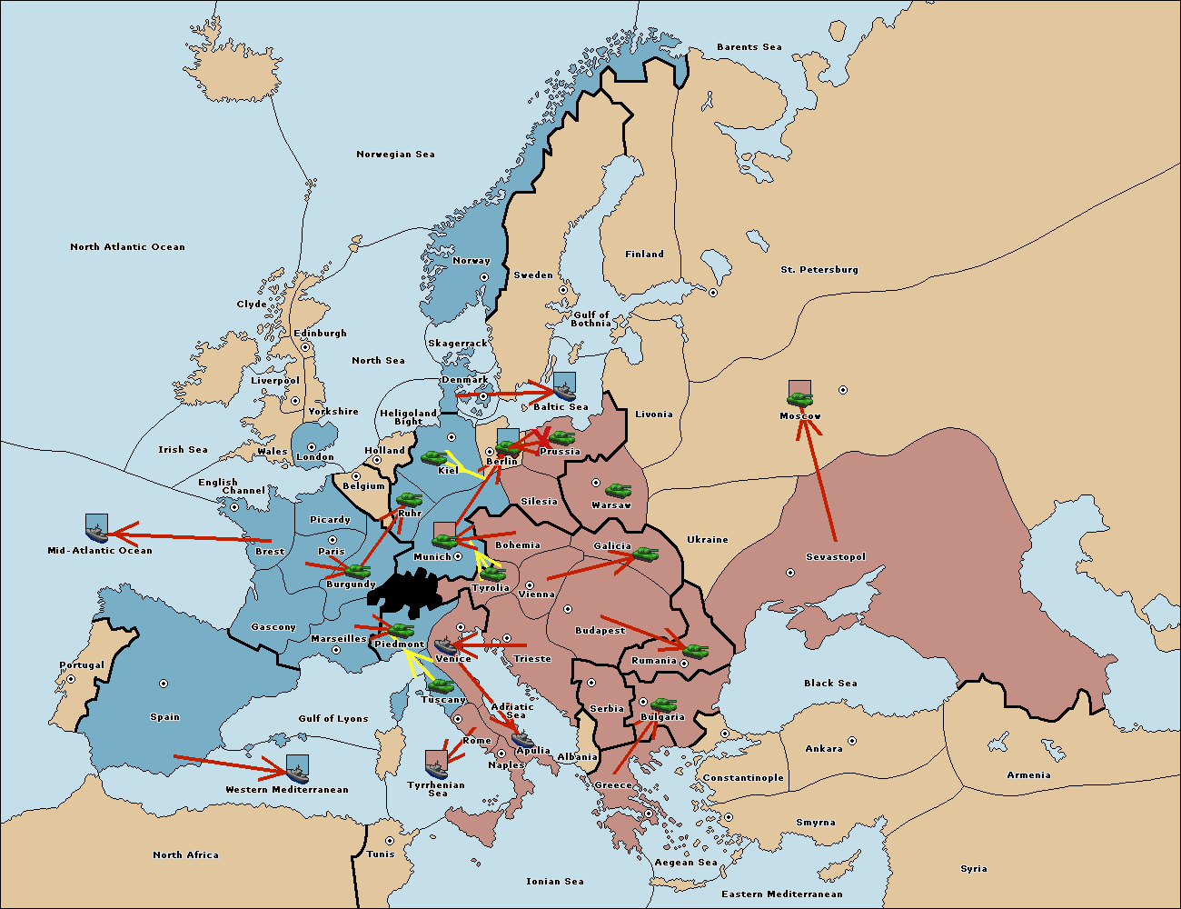 The army at Munich support move to Tyrolia from Piedmont.