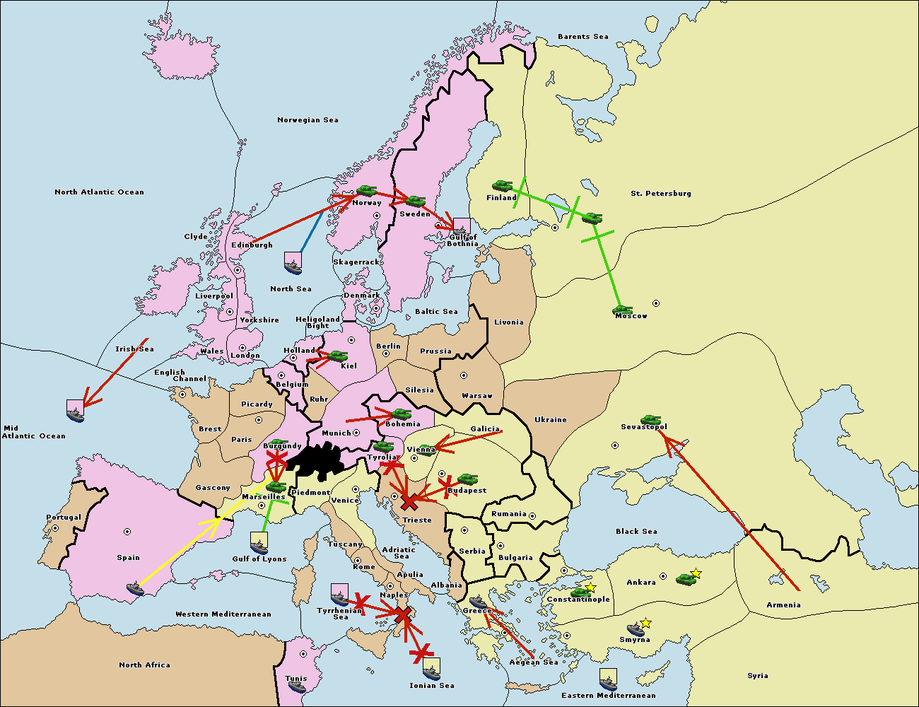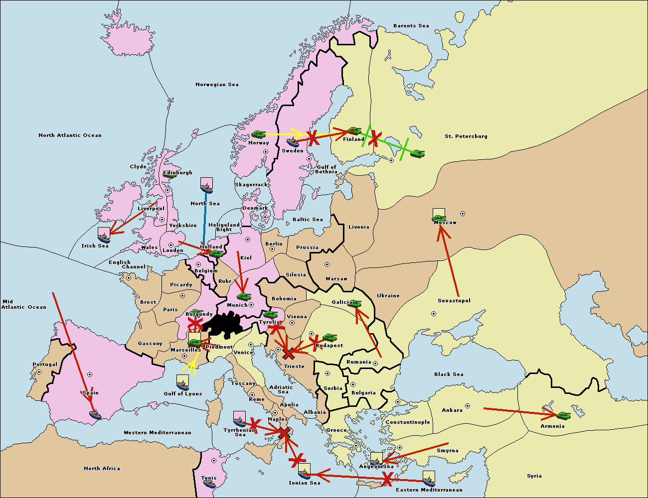 The fleet at Spain (South Coast) support move to Gulf of Lyons from Western Mediterranean.