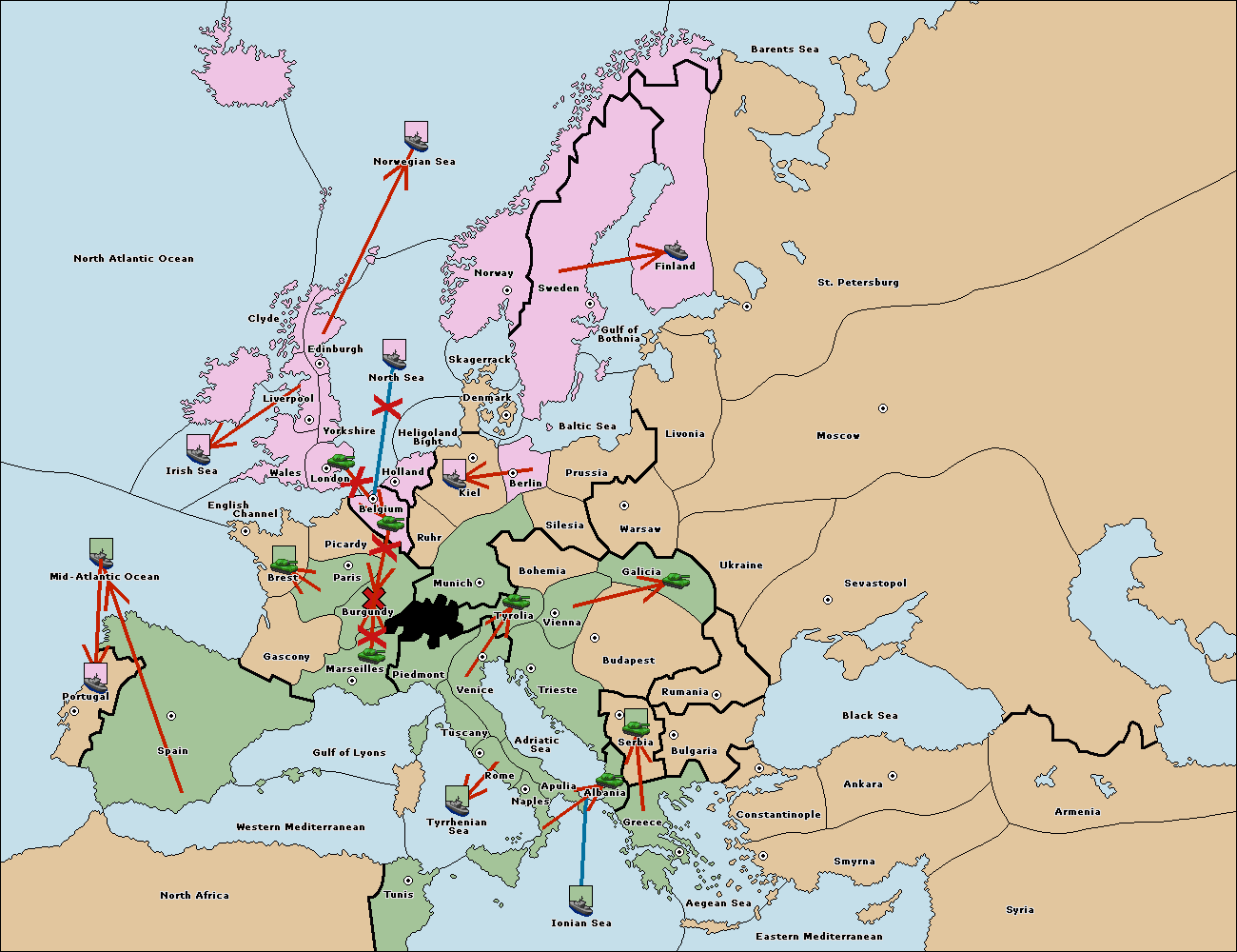 The fleet at North Africa move to Mid-Atlantic Ocean.