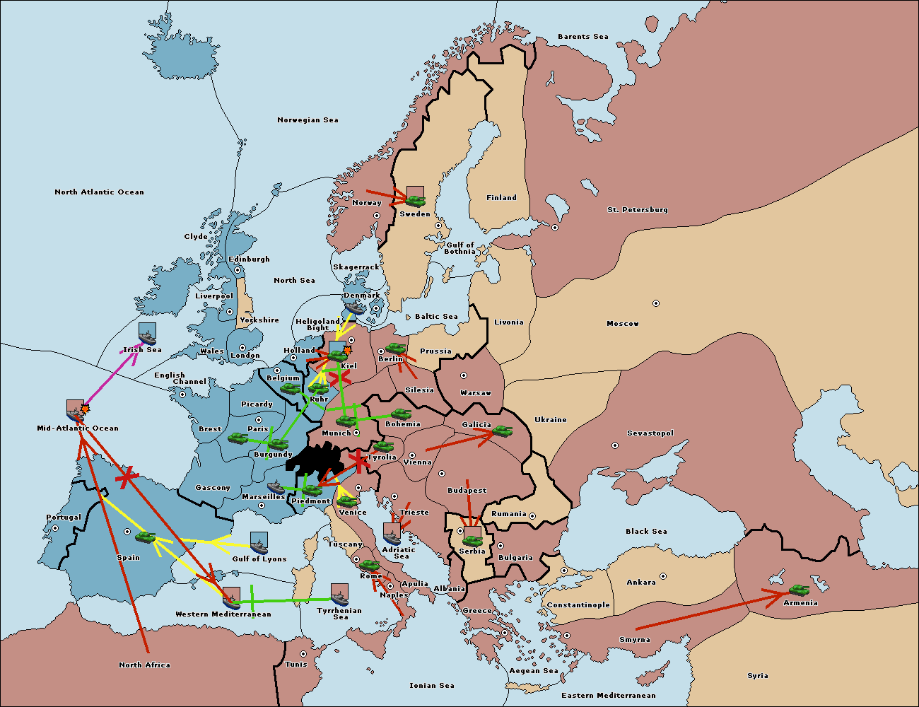 The fleet at North Africa move to Mid-Atlantic Ocean.