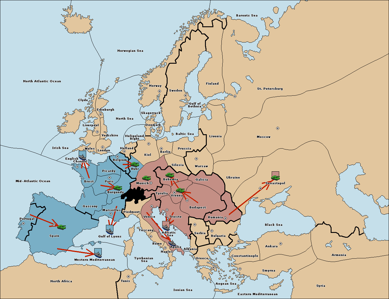 The fleet at Mid-Atlantic Ocean move to Western Mediterranean.