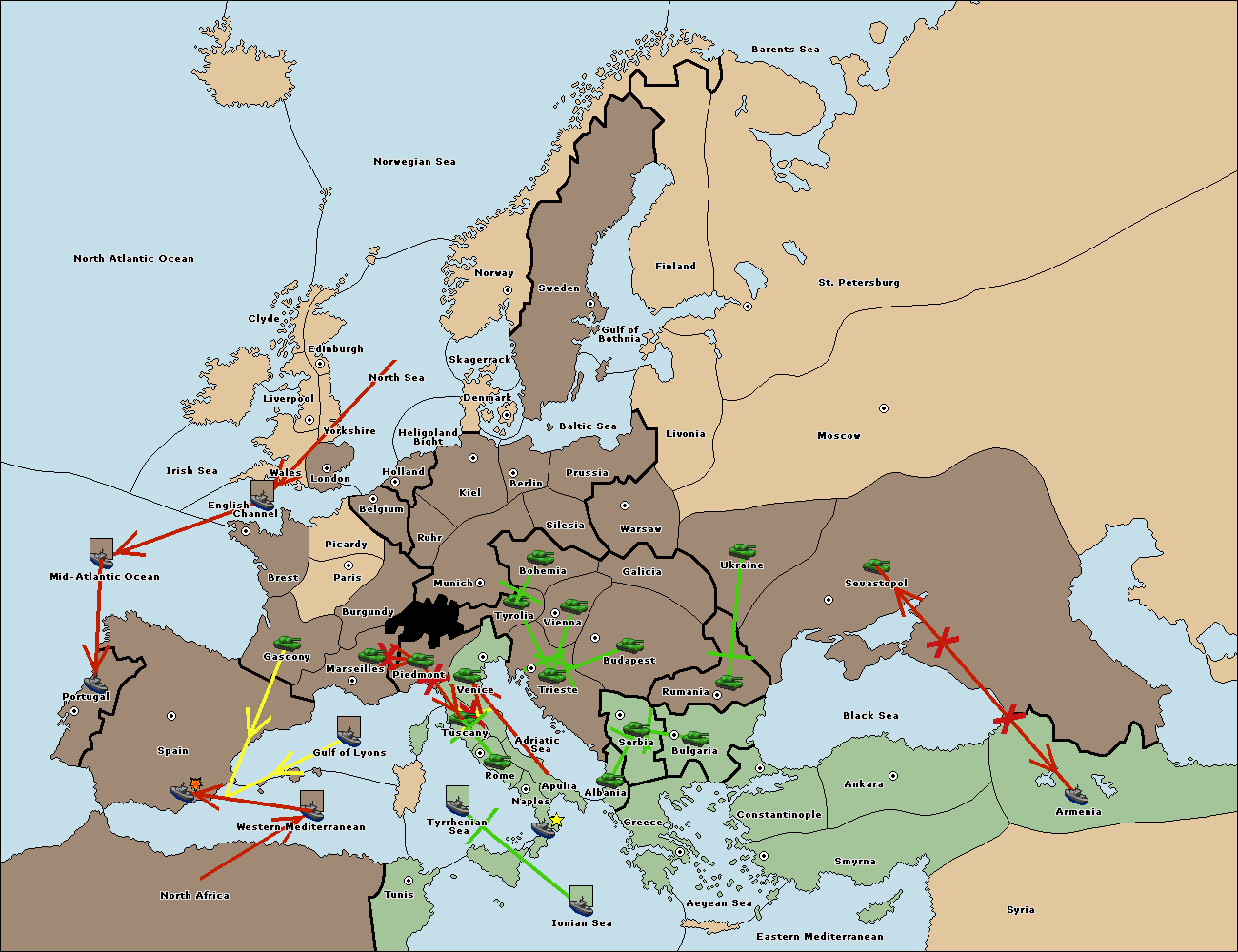 The fleet at Mid-Atlantic Ocean move to Western Mediterranean.