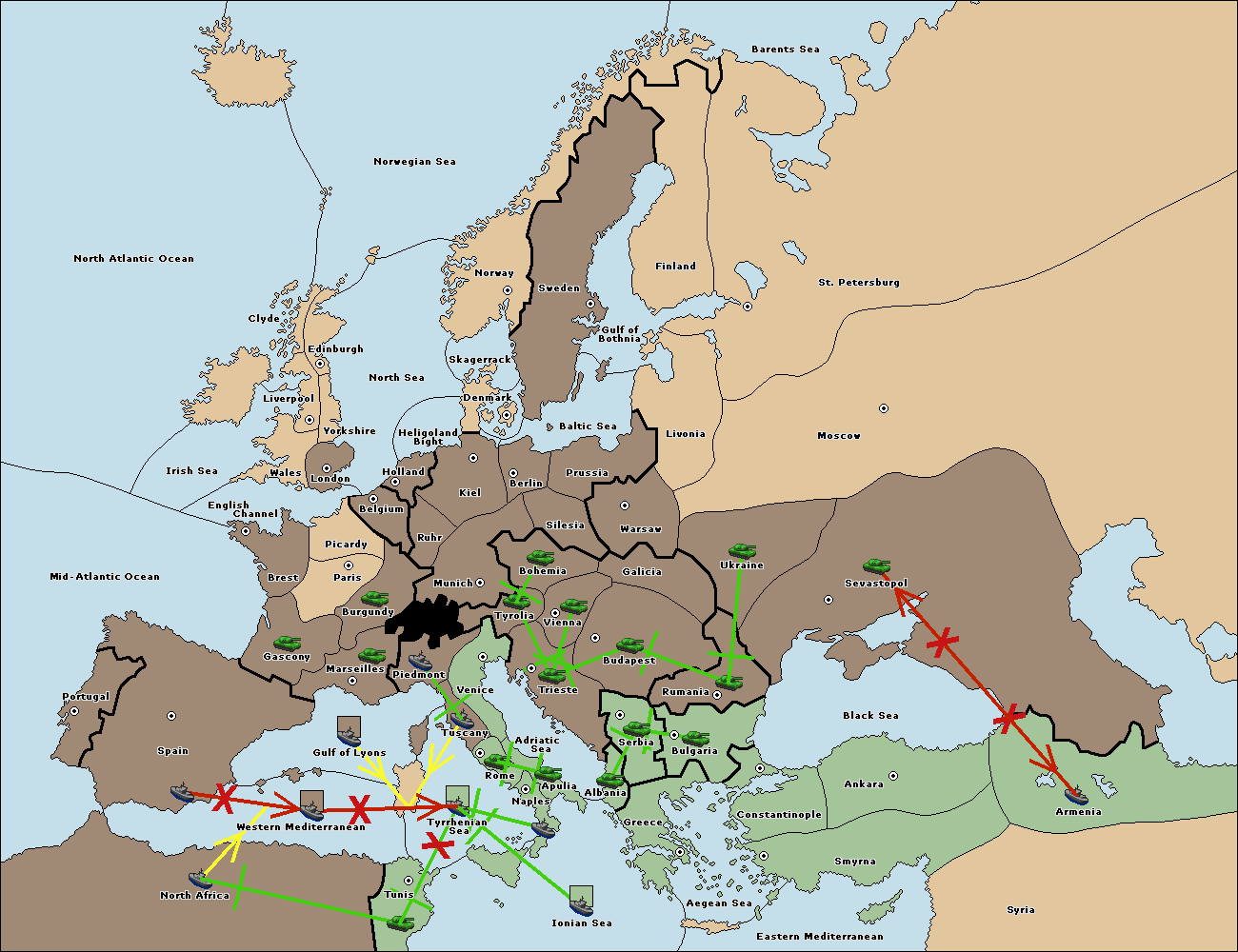 The fleet at Mid-Atlantic Ocean support move to Western Mediterranean from Gulf of Lyons.