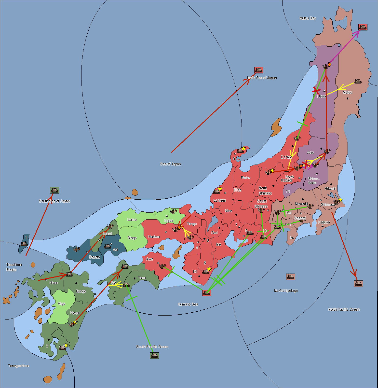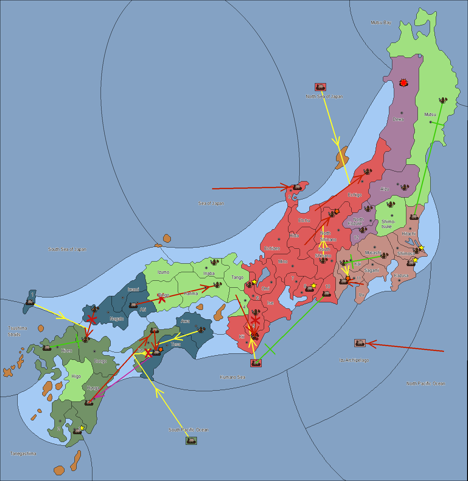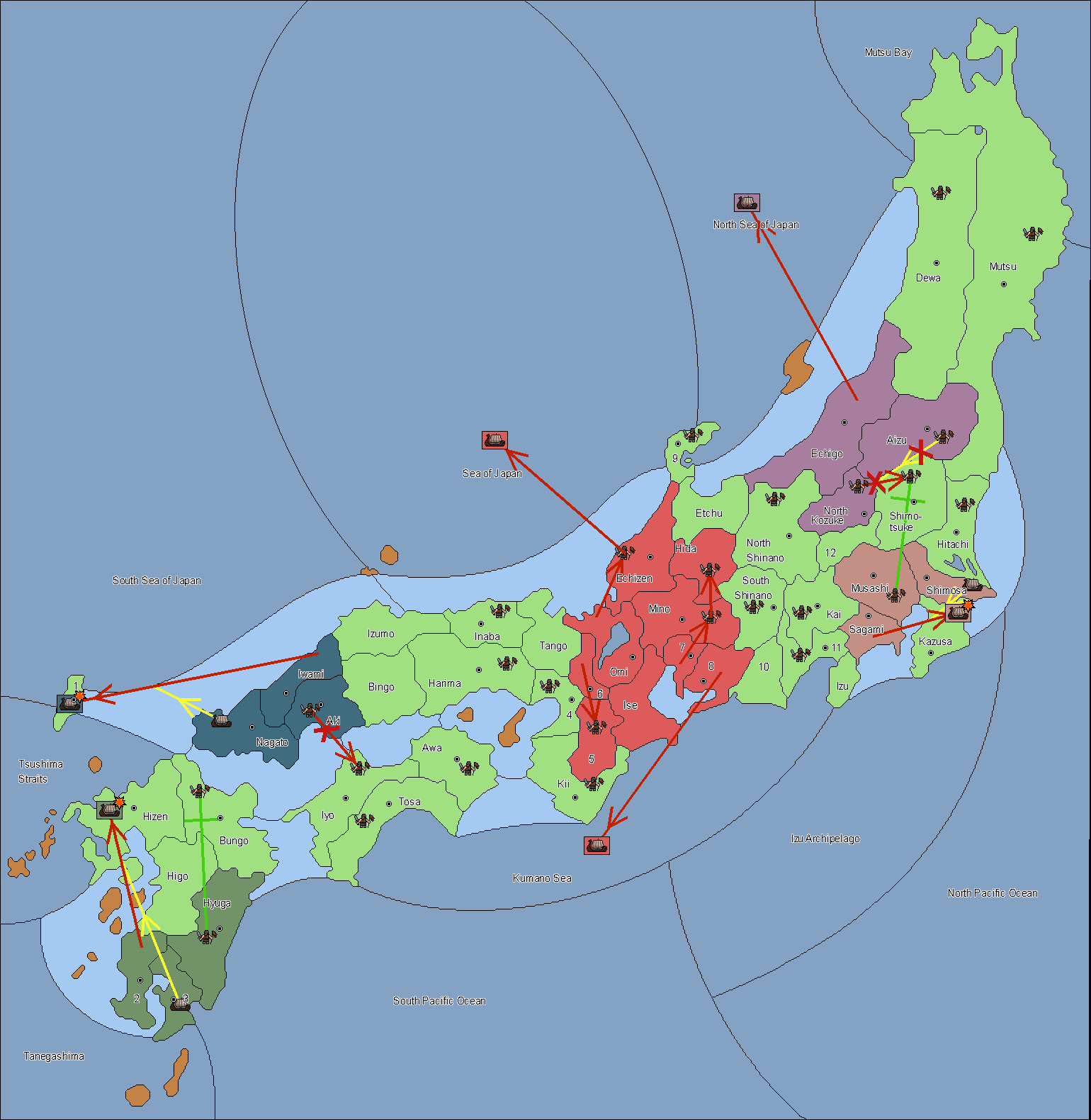 The fleet at Osumi (3) support move to Hizen from Satsuma (2).