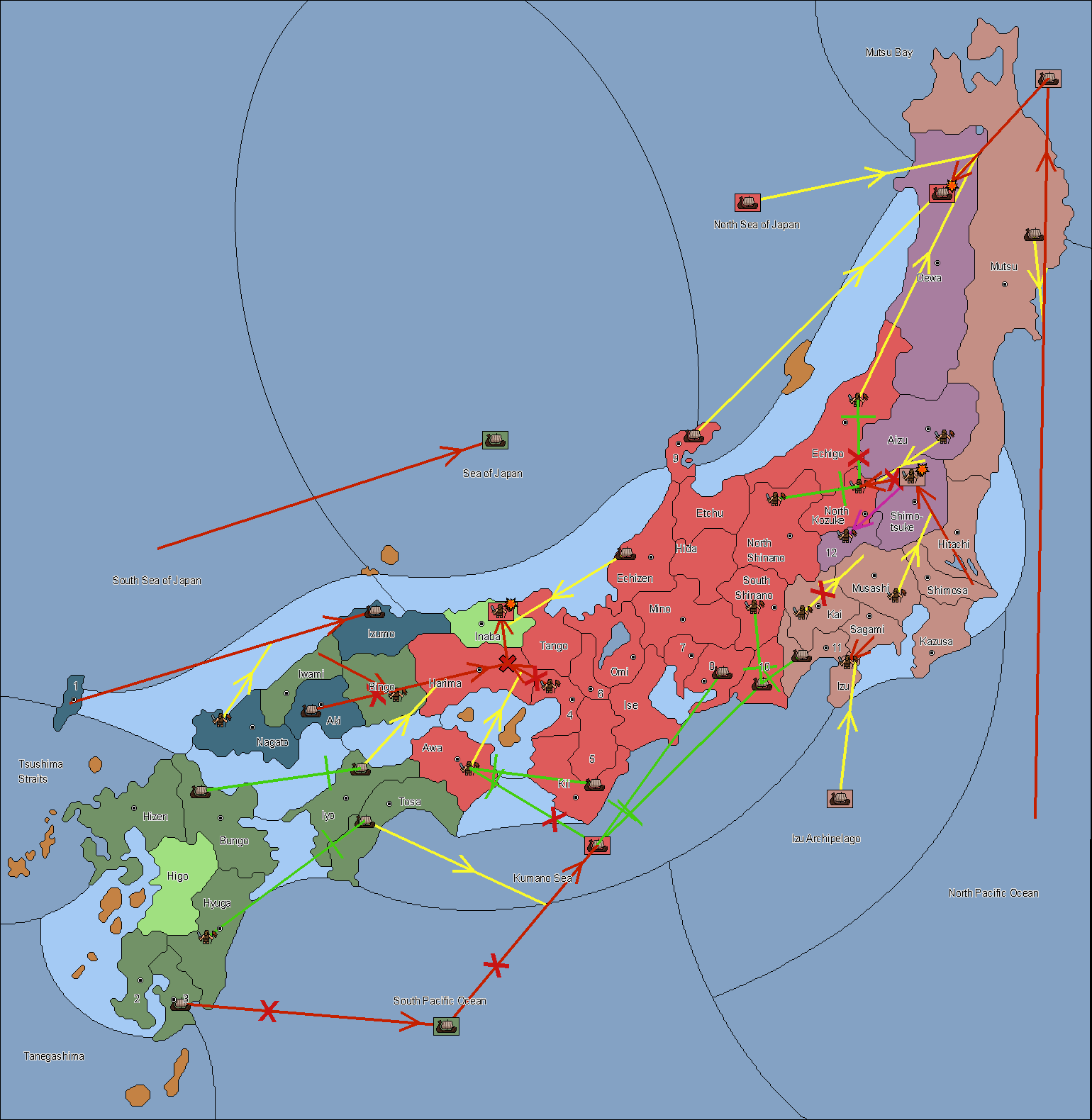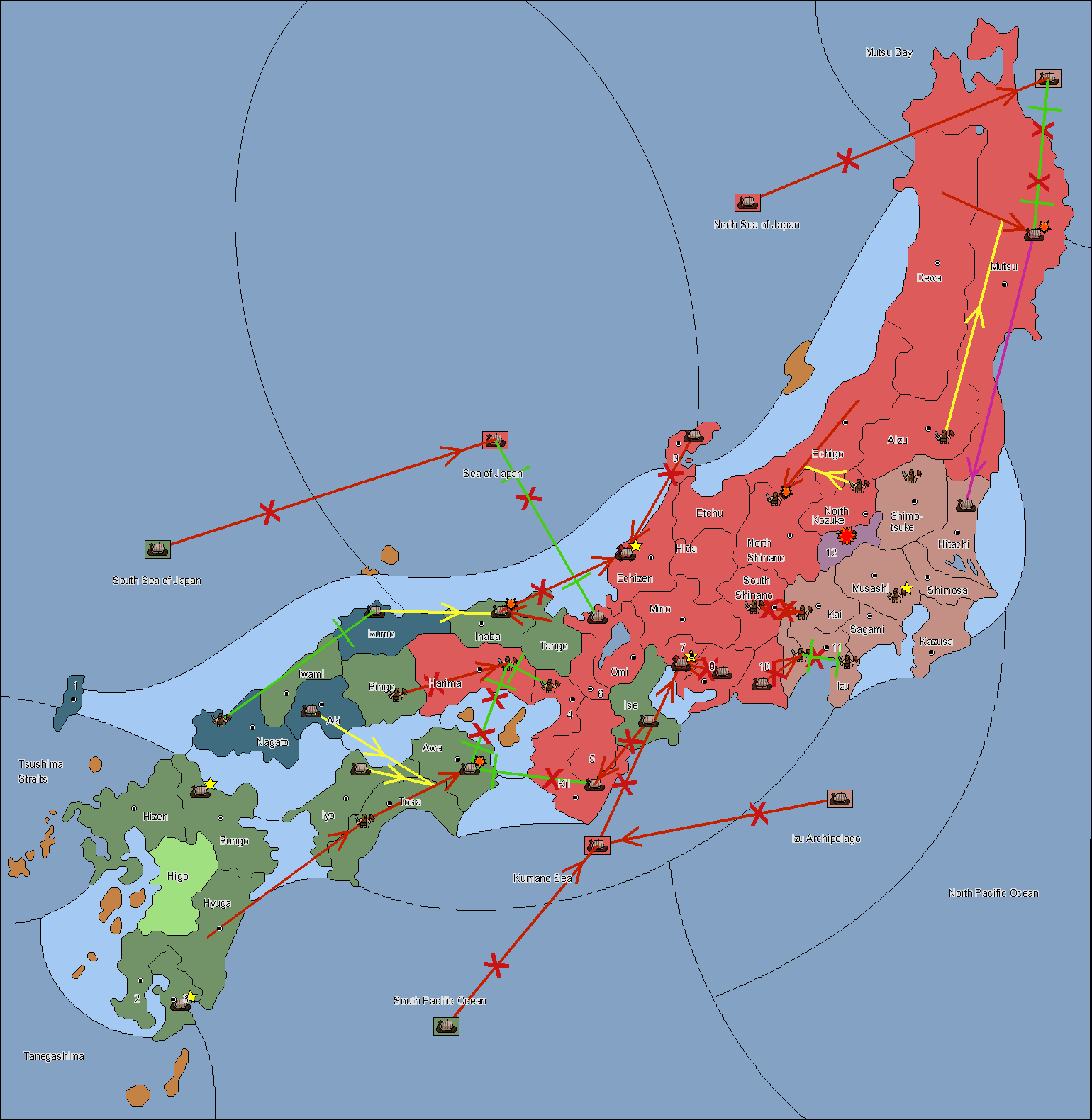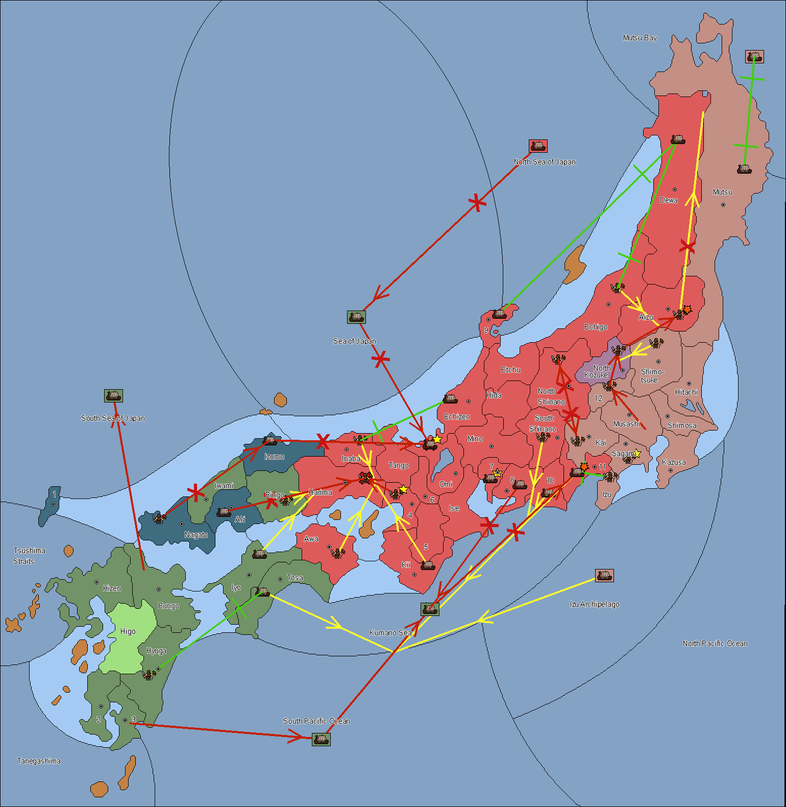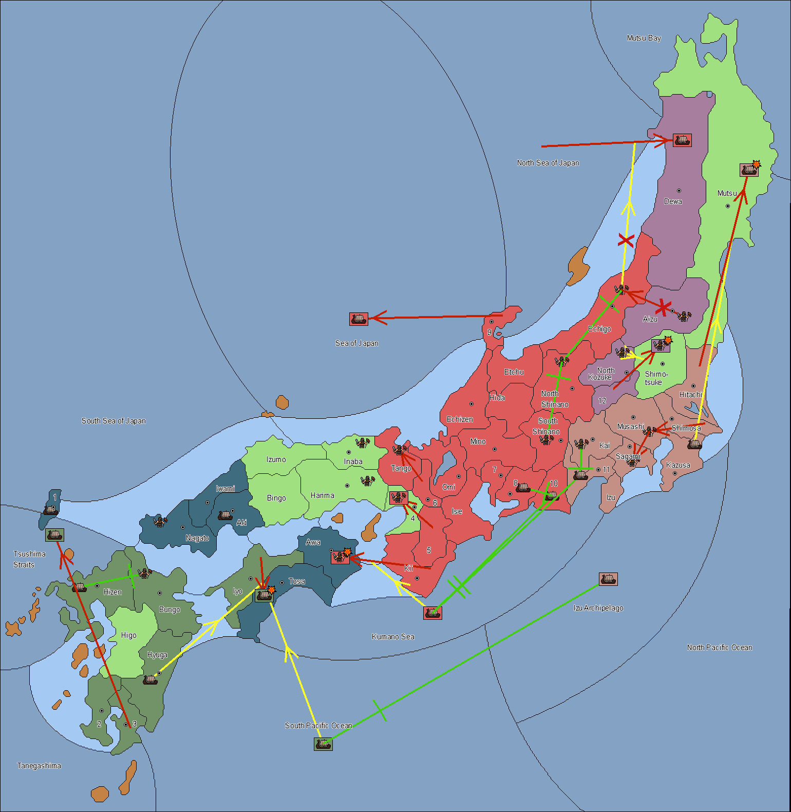 The fleet at Osumi (3) support move to Hizen from Satsuma (2).